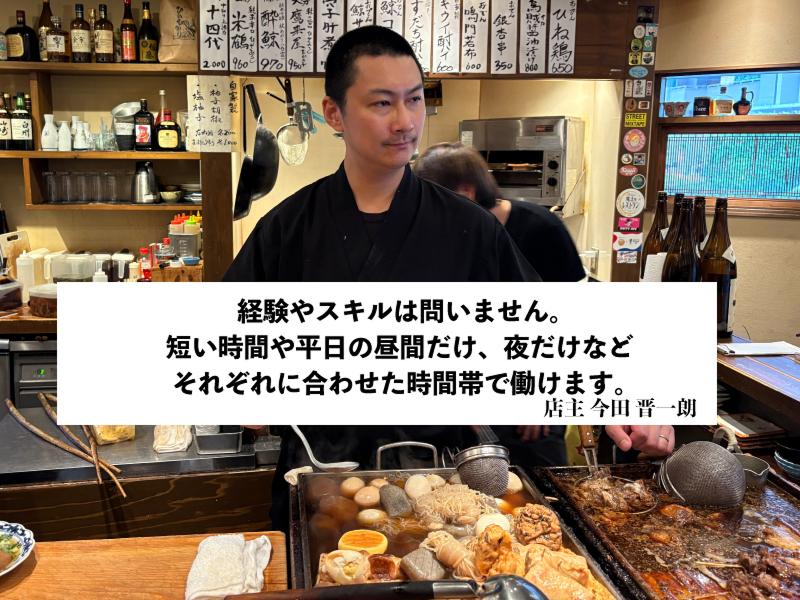 仕事内容: 求人ページをご覧いただき、ありがとうございます。 おでん まる米 店主の今田 晋一朗です。 当店はカウンター席のみの小さな居酒屋ですが、お客様との時間を大切にし、誠実で丁寧な接客を心がけています。 働くスタッフにとっても、安心して続けられる職場環境を大切にしています。未経験の方でも一からしっかりサポートしますのでご安心ください。 「ちょっとだけ働きたい」「ガッツリ稼ぎたい」どちらも大歓迎です! 11:00〜21:30の勤務時間でご都合の良い時間帯で3時間から勤務してもらえます。 お昼だけ働く主婦さん、夜だけ働く学生さん、ガッツリ終日勤務するフリーターさんなど それぞれに合わせた勤務形態で活躍してもらっています。 一緒に笑顔でお店を盛り上げてくれる仲間をお待ちしています。 以下、業務内容 * カウンターでの接客対応 * ドリンクの作成・提供 * 商品(料理)の提供 * 洗い物や片付け .