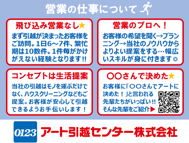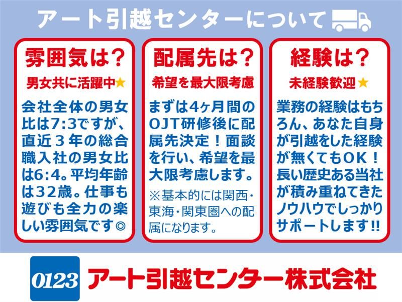 仕事内容 \\ 今の環境に、満足してる? //  ̄ ̄V ̄ ̄ ̄ ̄ ̄ ̄ ̄ ̄ ̄ ̄ ̄ ̄ ̄ ̄ ̄ ̄ 「今の会社、このままでいいのかな…」 「自分は、こんなもんじゃないはずだ…」 「やりがいも、休みも、給料も欲しい…」 「安定した会社で、再スタートしたい」 そんな想いを抱える 【第二新卒】のあなたへ。 その”モヤモヤ”は、”あなたの可能性”です アート引越センターで、 新しいキャリアをスタートしませんか? 創業50年!業界のリーディングカンパニー CMでおなじみ『0123』のアート引越センター 将来の不安なく、腰を据えて働けます。 その基盤があるからこそ、 社員の「働きやすさ」に本気です! \✨ 第二新卒も安心のポイント ✨/  ̄ ̄V ̄ ̄ ̄ ̄ ̄ ̄ ̄ ̄ ̄ ̄ ̄ ⭐100%反響営業のみ! 飛び込み・テレアポ・ノルマ一切なし! 「売る」のではなく「最適なご提案」を。 無理な新規開拓やノルマはありません。 ⭐未経験でも安心の研修制度 専用研修施設あり イチからプロのスキルを学べます。 ⭐『チームで戦う』面倒見の良い社風 困っている人を放置しない、 温かい社風です。 先輩・上司がしっかりあなたを育てます! ⭐頑張りが給与に直結! 平均月収36万円!インセンティブ充実! ⭐プライベートも超充実! 月8〜11日休み+有給取得(平均10日) 連休も取得OK! ⭐大手ならではの安定基盤 育休取得女性100%・男性42%、 借上社宅制度など 人生設計もバッチリです◎ ┏ ━━ ━━ ━━ ┓ ◆ お仕事内容 ◆ ┗ ━━ ━━ ━━ ┛ お客様の「人生の節目」である引越を サポートする営業(引っ越しプランナー)です。 【!】ここがポイント! ・100%反響営業です! ・飛び込みやテレアポは一切ありません。 ・個人ノルマもないので、お客様に じっくり向き合えます。 適性や希望に応じて配属します。 ▼ 個人営業 お問合せのあったお客様宅を訪問。 (1日5-6件程度) 引越日時や荷物の量、ご要望を伺い 最適なプランとお見積りをご提案します。 ▼ 法人営業 企業の「転勤」などを担当する部署へ 当社の引越サービスをご提案します。 既に取引のある企業様が中心です。 【勤務地】 ⭐各拠点で居住地・希望を考慮の上配属 ⭐U・Iターン歓迎!転勤なしも選べる ┏ ━━ ━━ ━━ ━━ ━━ ┓ ◆ 「大変そう」はもう古い! ◆ ┗ ━━ ━━ ━━ ━━ ━━ ┛ 引越業界のイメージを覆す 「働きやすさ」が自慢です! 〇 しっかり休める! ・月8〜11日休み(シフト制) ・年間休日114日 ・有給取得(平均10日以上!) ・連休OK!土日休みも相談可! 〇 しっかり稼げる! ・平均月収36万円! ・頑張りはインセンティブで正当に評価!