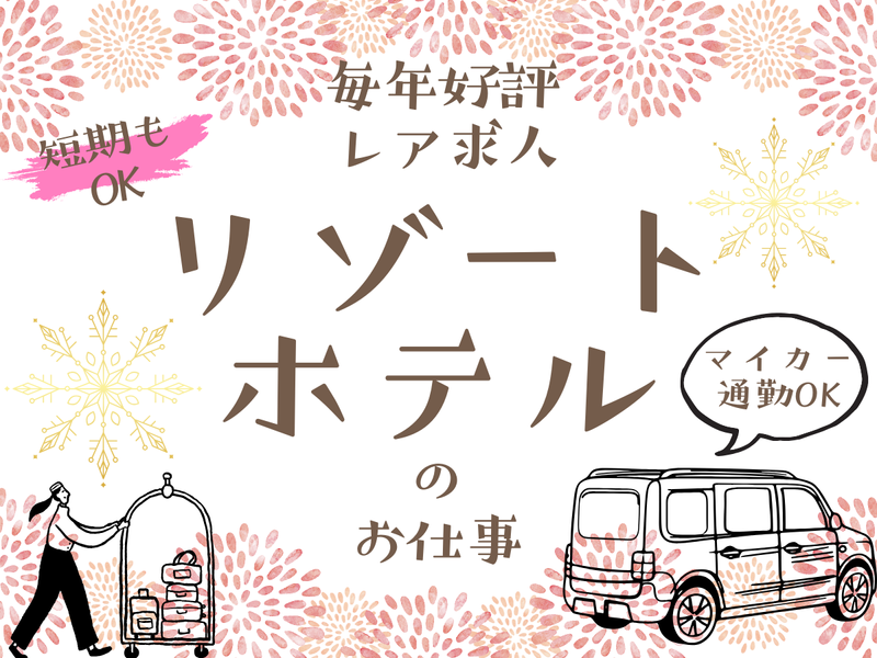 仕事内容 ✅18時~22時 ✅1日4H〜 ✅自然に囲まれたリゾート環境 ✅マイカー通勤 施設内の清掃や備品補充などを通して “快適なリゾート体験”を支えるお仕事です。 ================== <具体的には…> ・食器洗い ・布団敷きなど *夏期短期希望の方も応相談 ================== ◆この仕事のやりがい◆ ⭐ 自然と非日常感に癒される勤務環境  ̄ ̄V ̄ ̄ ̄ ̄ ̄ ̄ ̄ ̄ ̄ ̄ ̄ ̄ ̄ 出勤時の涼しい風、緑豊かな景色が 仕事の合間にリラックスを与えてくれます。 ⭐ 裏方だけど”人の役に立ってる”実感あり  ̄ ̄V ̄ ̄ ̄ ̄ ̄ ̄ ̄ ̄ ̄ ̄ ̄ ̄ ̄ お客様の「気持ちよく過ごせた」の声の裏には、 あなたの清掃・整備が欠かせません。 直接感謝されることは少なくても、 施設全体の印象を左右する大切なポジションです。 ⭐ 収入面でも安心!+送迎手当&通勤費あり  ̄ ̄V ̄ ̄ ̄ ̄ ̄ ̄ ̄ ̄ ̄ ̄ ̄ ̄ ̄ 車通勤者には交通費支給(上限5万円) 夏のイベント期間中は一部制限ありですが、 効率よくしっかり稼げます。