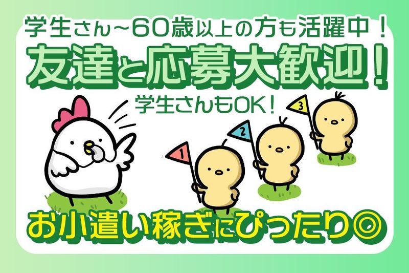 【保険制度】 雇用保険、労災保険、健康保険、厚生年金 待遇・福利厚生 【福利厚生】 ■交通費支給 ■事前研修あり ■単発のお仕事 残業もなく定時ピッタリに終われる♪ 単発でサクッと働ける! お小遣い稼ぎをしたい学生さんや ちょこっと働きたい中高年の方などに 人気のお仕事です◎ お仕事内容もとってもカンタン★ 事前に研修もあるので 未経験の方も安心してスタート+*