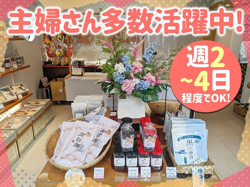 仕事内容 「誰が食べても“美味しい!”と感動される海苔を届けたい」 そんな想いから約7年前にオープンした海苔専門店 での店舗スタッフを募集します! 【具体的には…】 *販売・作業場での業務 ・店頭での接客・販売業務 ・お歳暮や贈答用ギフトの梱包 ・イベントの企画や準備のサポート *配達業務 ・加古川市内の取引先への配達 (週3~4回程度/12~16店を何曜日かに分けて回ります。) ・イベントの設営お手伝い ★慣れるまでは先輩が丁寧にサポートするのでご安心を◎ ★各業務のマニュアルをご用意! わからないことがあればマニュアルを確認できるように調整中です。 《当店について》 「誰が食べても“美味しい!”と感動される海苔を届けたい」 そんな代表の思いから約7年前にオープンしたお店です。 贈り物としても喜ばれる高品質な海苔を提供し、地域の皆さまに愛されています。