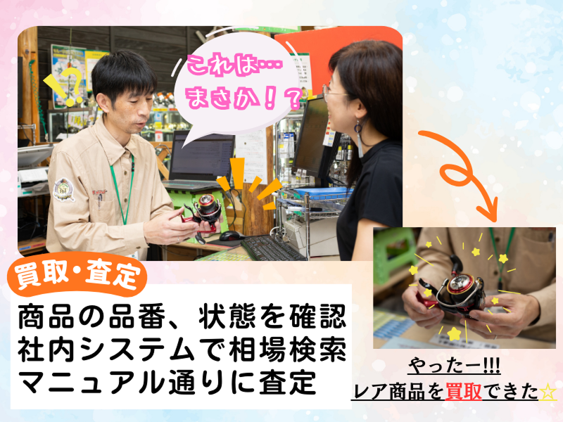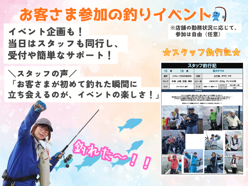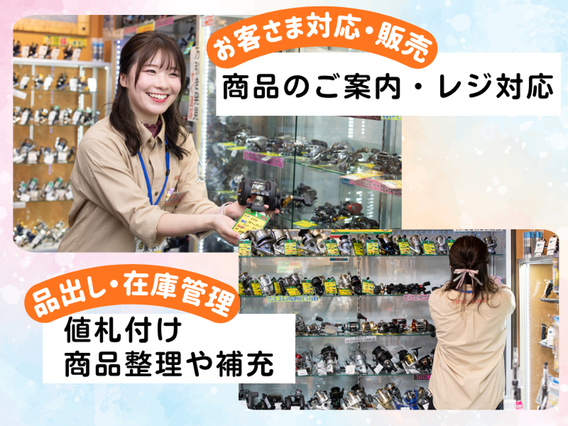 アピールポイント: 【休日制度も充実】 週休2日制(月9日休み) 年間休日は113日! 土日祝のお休みも相談可! 希望休もほぼ100%通るので、 帰省や旅行などプライベートの予定も立てやすく、長く続けやすい環境です。 【もちろん頑張りはしっかり評価!】 できることが増えた分は、 きちんと評価に反映される仕組みがあります。 「何ができればどの評価になるか」が分かるので、不安になりにくく、自分のペースで目標を立てやすく、毎日のモチベーションアップにもつながります! 将来、店長を目指していきたいなどの気持ちが芽生えたらしっかり応援します! アピール 【釣り具ショップならではの面白い仕事も!】 お客さま参加の釣りイベント ・トラウト企画 ・初心者向け実釣イベント…など 私たちスタッフも同行し、受付や簡単なサポートを担当。 お客さまだけじゃなく、お子さんとも交流できるから、、益々お客さまとの会話も楽しくなります♪ また、公式LINEで南港、泉大津、岸和田、和歌山など、のイベント・釣果情報、人気スポットを毎週発信♪