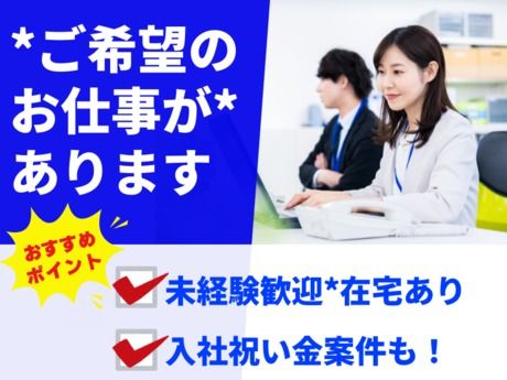 資格 ●パソコンの基本操作可能な方 ●オフィスワーク・コールセンター未経験OK ●未経験からスタートして 活躍中のスタッフ多数在籍中! ●友達や知人の方との応募も大歓迎♪ ●学生さんの応募も大歓迎!