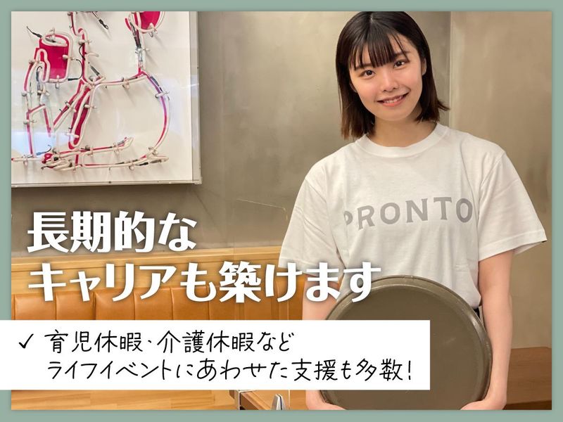 仕事内容 +…・…*…・…*…・…*…・…+ ⭐次世代キャリア採用!第二新卒歓迎! ⭐サントリーグループの安定基盤 ⭐福利厚生充実! 大手企業ならではの働きやすさ ⭐休暇制度充実!ライフワークバランス◎ ⭐ダイナミックホリデー制度で 長期休暇も取得可能 ⭐20代・30代若手中心に活躍中! ⭐店長経験がある方は月収30万円以上可 +…・…*…・…*…・…*…・…+ \こんな方にピッタリ!/ ・入社後にギャップがあり、 新卒で入った企業をすぐに辞めてしまった ・若手が活躍する職場で同世代と働きたい ・大手企業で安定して働きたい ・職場の仲間と和やかな雰囲気で働きたい! <具体的な仕事内容> 昼はカフェ、夜はサカバの2つの顔を持つお店での ・接客 ・調理 ・売上管理 ・スタッフ育成等の 店舗管理業務全般をお任せします。 <朝から昼はセルフサービスでのカフェ形式> こだわりのラテを1杯ずつ淹れたり、 ケーキやパスタ、パンなどを提供します。 <夜は大人なキッサカバ> サントリープレミアムモルツやハイボールなどの 種類豊富なドリンクや本格的な料理を提供します。 ✅とても和やかな雰囲気の職場です! お客様に心地よい時間を お届けすることを重視していると同時に、 働くスタッフにも心地よい時間を 過ごしてほしいと思っています。 研修制度やフォロー体制も整っているから 安心してオペレーションの習得を目指してください! まわりの先輩も同年代が多いので 和やかな雰囲気で質問もしやすいですよ! ================= プロントコーポレーションについて ================= PRONTOを中心に 300店舗を全国に展開する当社。 30年前のカフェ&バーブームの中で誕生し 時代の変化に合わせて新ブランドを続々展開。 安定した経営基盤のもと成長を続けています。 これからも妥協することなく お客さまのニーズと向き合い、 愛される店舗づくりを進めていくために 新たな仲間を募集します。 ================ 当社で働くメリット ================ ✅十人十色の店舗だからこそ身につく知識 当社は昼も夜も確実ににぎわう店舗展開を求め 来客数が見込める駅ビルや 空港などを中心に出店。 基本的なブランドコンセプトはおさえながらも 1店舗1店舗デザインも内装も 異なるお店づくりをしています。 お客様の層・エリア・時間帯に あわせたサービス内容により 個人店のようなお客様との 距離間を大切にしつつ チェーン店としての安定性も 兼ね備えた環境です。 さらに「Di PUNTO」「E PRONTO」 「和カフェ Tsumugi」など 複数のブランドを展開しているため、 1社にいながらも転職せずに 様々な業態・ジャンルに挑戦でき、 希望のキャリアを形成することができますよ! ✅大手企業ならではの充実した福利厚生 サントリーグループならではの 職場環境が揃っております。 ✨月8~10日休み。 福利厚生は20種類以上!! 「飲食業界はなかなか休みがとれなさそう…」という方も ダイナミックホリデー制度 (5連休を年2回取得)などを利用し ワークライフバランスも維持できますよ! ✨サントリー共済会 当社で働く社員・またはご家族が 安心して生活・仕事ができるような支援。 お子さんのお誕生日やご家族の介護費用、 ベビーシッター費用など ライフイベントに合わせた費用補助を行っています。 ✨サントリーグループ社販サイト サントリーグループの美容食品や 飲料(清涼飲料・酒類)が 特別価格で購入可能! その他サントリーホール主催の公演チケットが 割引でご購入いただけるなど グループの特典も多数! =============== 入社後の流れ =============== ■本社(東京都港区)で研修を実施して頂きます。 その後、店舗に立ち接客や調理を覚え 慣れてきたら、収支管理やアルバイトスタッフの教育、 シフト管理など店舗管理の業務をお任せします。 ■段階に応じて、バリスタ研修やワイナリー見学などの 特別研修があります。 少しずつスキルを身に付けられる環境です。 =============== 豊富なキャリアステップ =============== 年2回実施する試験後、店長へ昇格となります。 その後、売上・利益・経費の予算作成、 販促企画、人材管理・育成までマスターしていただきましたら、 入社3年(実力に応じて)を目安にSVとして ご活躍いただきたいと考えています。 <その他キャリアステップの例> ・アシスタントスーパーバイザー ・スーパーバイザー ・MGR ・部長 ・購買・商品開発 ・企画開発 ・物件開発 ・経営企画 ・営業本部長 ・その他管理部門(人事・総務など)