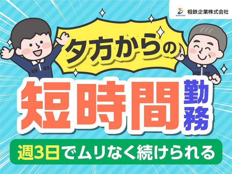 仕事内容 ‥‥‥‥‥‥‥‥‥*‥‥‥‥‥‥‥‥‥ 「夕方からのスキマ時間でサクッと」 自分にピッタリ!理想の働き方が叶う♪ ‥‥‥‥‥‥‥‥‥‥‥‥‥‥‥‥‥‥‥ <スポーツクラブの清掃スタッフ> 40代・50代・60代の男性活躍中♪ 週3日でOK!無理なく効率よく稼げる◎ ┼────────── *おすすめポイント* ──────────┼ ■駅チカ徒歩5分!複数駅からアクセス可◎ ■週3日でOK!無理なく私生活と両立♪ ■扶養内勤務OK!Wワークも相談可◎ ■未経験歓迎!ブランクOK! ■40代~60代活躍中!中高年も多数在籍◎ ■セカンドキャリアとしても◎ ■安定の相鉄グループ企業!長期勤務◎ (平日)17:40~22:30 (土曜日)17:00~21:00 (日曜日)17:00~20:00 ■月~日曜日(祝日含む)の中で 週3日シフト制 *.:.⌒.:.*.:.⌒.:.*.:.⌒.:.*.:.⌒.:.* お任せするお仕事は… ───v──────── 建物ピカピカで気分も晴れやか…** スポーツクラブ内の清掃作業をお任せ! ・消耗品の補充 (ボディーソープ・綿棒など) ・脱衣室床面の掃き・拭き掃除 など 難しい作業は一切ありません◎ 長年勤めているベテランスタッフは 面倒見の良い優しい人ばかり! わからないことは丁寧に教えてくれます♪ <コツコツ作業!> 自分のペースで黙々と作業できる◎ お客様に気持ちよく利用してもらえるよう 丁寧に仕上げてください☆ キレイになると自分も気持ちいい♪ <プロの技が学べる!> 場所に応じた汚れ落としのテクや 効率的に作業を進めるコツなど 先輩スタッフが丁寧に教えます♪ おうちのお掃除にも活かせます◎ <知識・経験・年齢不問!> 「働きに出るのは久しぶり…」 「初めての仕事で不安…」 そんな方ももちろん大歓迎です! 安心して始められる環境を整えています。 ============ 相鉄企業株式会社について ============ 昭和36年、ビルの清掃管理業務を メインに設立。 現在は従業員数約2000人の規模に成長し、 鉄道会社を母体とした相鉄グループの 企業という安定性があります。 ビルメンテナンス業の他、 環境サービス業・設備工事業 指定管理者業務・不動産賃貸業なども行い、 生活に密着したサービス お客さまのニーズを捉えた 裾野の広いサービスを提供し、 地域社会の発展に貢献しています。 =============== スタッフインタビュー/60代男性 =============== 定年退職後に家でじっとしているより 体を動かしたい!と考えていました。 こちらは週3日で勤務時間も短時間! 負担なく働けそうだったので、 思い切って応募を決めました。 日頃から掃除は嫌いではないので、 抵抗なく始めることができました。 清掃のコツや効率的な進め方などを 先輩が丁寧に教えてくれて、 プロの技術を習得できたことは 家の掃除にも活かせるのも大きな メリットになっています◎ 家では私は掃除担当になりました。 キレイにすることで心もすっきりし、 趣味のように楽しめています! 収入を得ることだけでなく、 適度な運動で、健康的に過ごせています。 「何歳からでも新しいことが始められる」 と身に染みて感じることができています。 挑戦してみて良かったです。