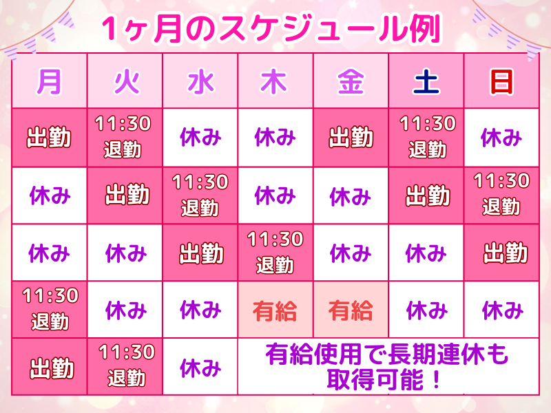 勤務時間詳細 総労働時間:1ヶ月あたり150時間15分 〜 171時間 <勤務時間> 10:30~翌11:30(実働時間20時間45分) (休憩4時間15分※仮眠含む) ~1日の流れの一例~ 10:30 出勤・制服に着替える 11:00 朝礼・引継ぎ・予約数の確認など 15:00 チェックイン対応・フロント対応 24:00 仮眠・休憩 04:00 ロビー設置のアメニティ補充 06:00 朝食会場のお手伝いなど 08:00 チェックアウト対応・引継ぎ 11:30 退勤 <その他> 月1回フロントミーティングあり ▶10:00~16:00(休憩1時間) ※無料で昼食も提供されます。