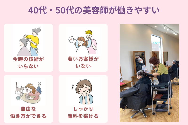 職場環境 <こんなサロン♪> *グループ店舗では50代スタッフやパパ・ママ美容師、主夫・主婦活躍中! *予約・指名は一切なし! *シンプルな技術だからブランクのある方も復帰しやすい! *年齢不問!同世代のお客様を対応したい方にピッタリ★