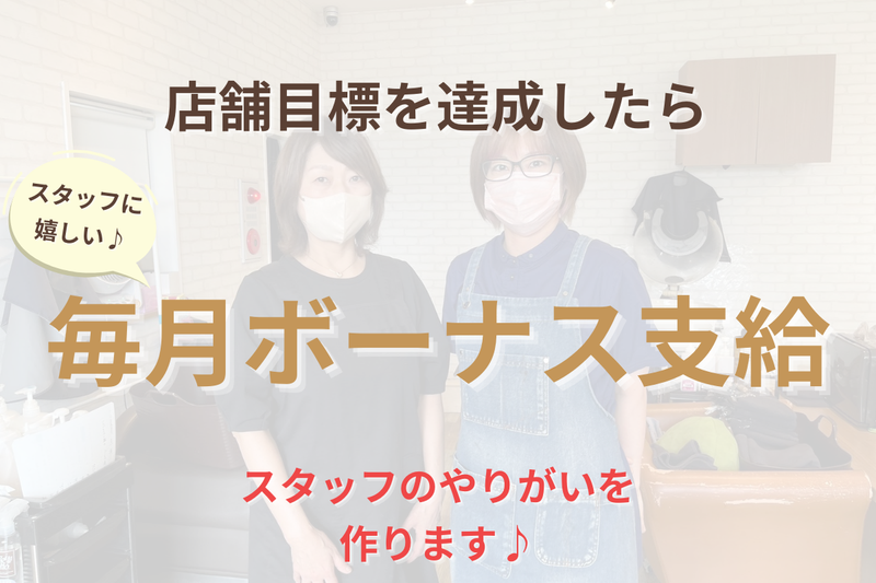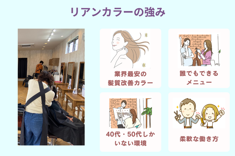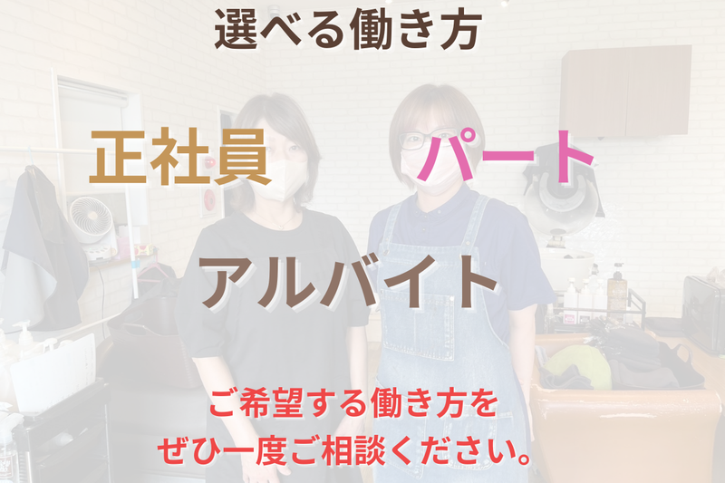 仕事内容 【12月上旬★カラー専門店オープン!】 地元のお客様が来店されるカラー専門店のオープニングスタッフを募集! 30代、40代、50代、60代以上のお客様が気軽に来店できるサロンを目指します! 来店されるお客様へカラーの他、メンテナンスカット(2センチ以内のカット)をお任せします。 カットは揃えるくらいのメンテナスカットのため、基本の技術ができればOK! ブランクのある方や技術に不安な方でも大丈夫です! 水素の力を使った髪質改善カラーはサロンのこだわりのメニューです。 リーズナブルな価格でも、高品質の消費を提供します♪ <ご来店~施術の流れ> 1.受付表にお名前をご記入 2.スタッフとカラーの色を確認 3.カラー塗布 4.シャンプー 5.お会計後セルフブロー <働きやすいポイント> *子育てママ活躍中!育児との両立に理解ある職場! *ブランク・Wワーク歓迎!土日のみも可! *週1日~勤務OK!働き方は柔軟に対応します! *白髪染め・ほぼ単色のみ・難しい技術ナシ!