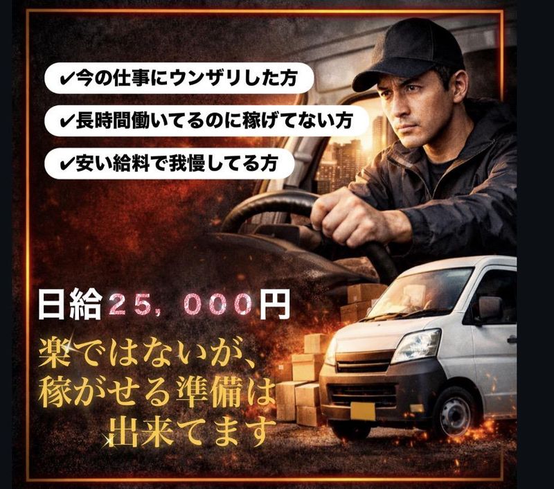 仕事内容 正直に言います。 この仕事は楽じゃありません。 でも、 ・今の給料が安すぎる ・拘束時間が長いのに稼げない ・評価されない会社に嫌気がさしている そんな人にとっては、「現実的に人生を変えられる仕事」です。 軽貨物はどこも同じ。 いいえ、Eight Luckは「本気で稼ぎたい人専用」です。 / 仕事内容 \ ・軽バンでの宅配業務(個人宅・企業向け) ・エリア固定/ルート安定 ・1日200〜300個前後(エリア・経験により調整) / 報酬 \ 日給25,000円前後(出来高制/固定エリア) 【月収モデル】 ・フル稼働(初心者):月22日 → 約50万円 ・フル稼働(上級者):月22日 → 約65万円 ・高稼働(初心者) :月26日 → 約60万円 ・高稼働(上級者) :月26日 → 約80万円 ※金額はあくまで過去実績例であり保証ではありません。 / Eight Luckの“異常な”ポイント \ 他社と違う点を正直に書きます。 ✔ 荷量が安定(日によって激減しません) ✔ エリア固定(毎日道を覚え直すストレスなし) ✔ 新人を放置しない (しっかり面倒見ます) ✔ 稼げる人はちゃんと稼がせる(案件・荷量を寄せます)