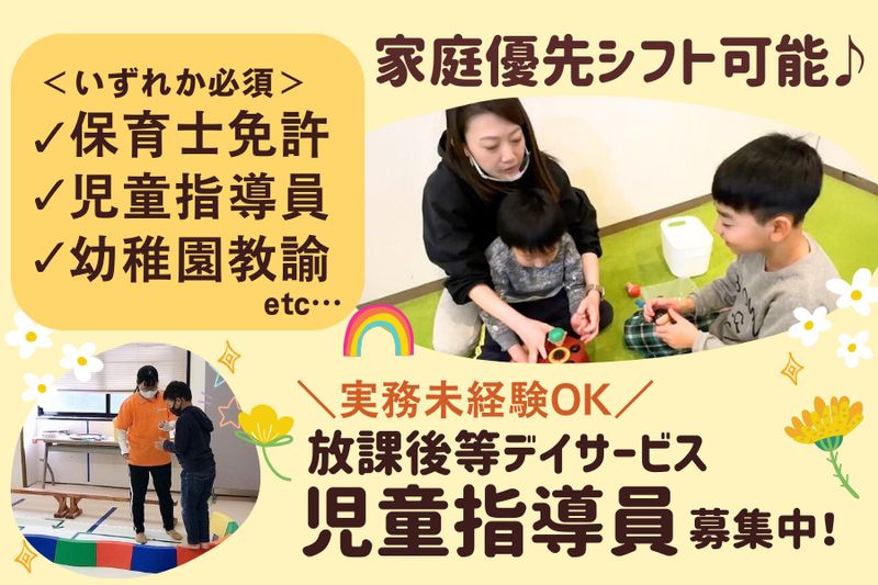 【応募資格】 【必須】 下記のいずれかに該当する方 →保育士・児童指導員任用資格・幼稚園教諭・小中高の教員免許・社会福祉士・精神保健福祉士・心理/教育/社会/社会福祉の学科や研究科卒業生 【優遇】 保育士の実務経験5年以上の方(時給1,300円~スタート) 保育所等訪問支援が可能な方(訪問中の時給2,500円) 【あれば尚可】 普通自動車免許(AT限定可) ★実務未経験OK・ブランクOK ★扶養内勤務OK 【メリット】 #扶養内勤務OK #副業・WワークOK #主婦・主夫歓迎 #長期 #バイク通勤OK #急募 #シフト自由 #車通勤OK #有資格者歓迎 #リモート面接OK #経験者歓迎 #未経験者歓迎 #転勤なし #平日のみOK #研修あり #制服貸与 #50代も応募可 #週2・3日からOK #家庭都合休OK #長期休暇あり #週4日以上OK #昇給あり #40代も応募可 #交通費支給 #髪型・髪色自由 #スキマ時間勤務 #ブランクOK