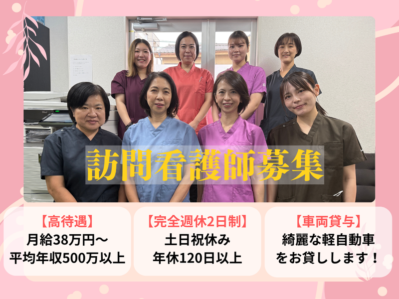 求めている人材 未経験OK!年齢不問! 人柄重視の採用です! 《必須条件》 資格:看護師 《歓迎条件》 ・臨床(病棟)での実務経験 ・普通自動車運転免許(AT限定可) ※訪問で使用するため ・基本的なPCスキル(記録入力のため) ⭐こんな方はすぐに活躍できます⭐ ・病院での経験を、これからは「在宅」の場で活かしたい方 ・利用者様やご家族と、明るく誠実なコミュニケーションが取れる方 ⭐こんなあなたを待っています!⭐ ・流れ作業ではなく、一人ひとりにじっくり寄り添う看護がしたい方 ・「ありがとう」が身近にある、地域に根差したケアに魅力を感じる方 ・チームワークを大切に、仲間と支え合いながら働きたい方 ・ご自宅での「その人らしい暮らし」を支える仕事にやりがいを感じる方