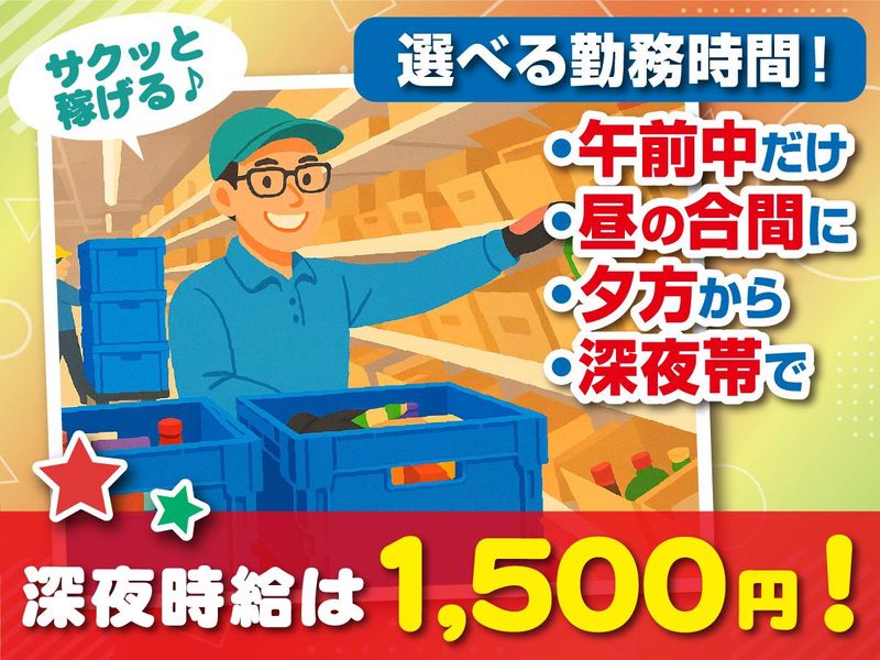 仕事内容 ✅ オススメポイント! ★未経験者大歓迎! ★時給1200円~/22時以降は深夜時給にて時給1500円! ★8時~翌5時までの間で選べる勤務時間/1日4h~・週3日~OK! ★土日祝のみOK!平日のみもOK!勤務日数は応相談! ★学生、フリーターの方はもちろん、主婦(夫)さんも活躍中♪ ★仕事はカンタン・コツコツ作業で接客もナシ! ★倉庫内作業で、快適勤務♪ ★友達同士での応募もOK!お友達と一緒に楽しく働ける♪ ★長期で安定して勤務できる! ✅ 具体的には… 大手スーパー物流センターでのお仕事です! \キレイな職場です/ ■ 仕分け・検品作業 ■  ̄ ̄ ̄ ̄ ̄ ̄ ̄ ̄ ̄ ̄ ̄ スーパー向けのチルド商品のカンタンな仕分けや検品作業など! 男女ともに活躍中です! 未経験の方にも丁寧にお教えします! \安心してスタートしてくださいね!/ ■ 勤務時間例 ■  ̄ ̄ ̄ ̄ ̄ ̄ ̄ ̄ 8時~12時、8時~17時 9時~13時、9時~18時 13時~18時、13時~21時 17時~22時、18時~23時 20時~翌1時、22時~翌2時 22時~翌5時など …他にも勤務時間多数あり! ■ 事業内容 ■  ̄ ̄ ̄ ̄ ̄ ̄ ̄ 派遣業(派27-300815)