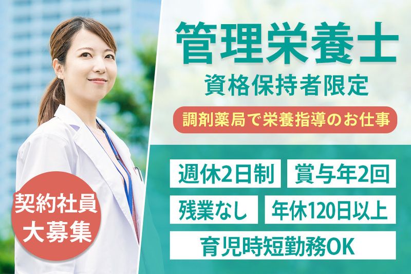 【アピールポイント】 管理栄養士を契約社員で募集! 保険調剤薬局での勤務です ◇未経験応援 ◇残業なし ◇賞与年2回 ※管理栄養士資格お持ちの方限定※