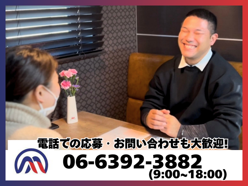 選考プロセス 【✅応募後の流れ】 ①WEBで簡単応募 お電話での応募もOK! ☎06-6392-3882 ↓ ②採用担当から連絡 メール・ショートメール もしくはお電話でご連絡いたします。 ↓ ③面接 経験よりも人柄重視◎ ざっくばらんにお話ししましょう! ↓ ④採用 入社日などは お気軽にご相談ください! ※他社様で採用が決まった際や、 何らかの事情で面接に遅れそうな際は 事前にご連絡いただければ安心致します。 面接日の変更もお気軽にご相談ください!