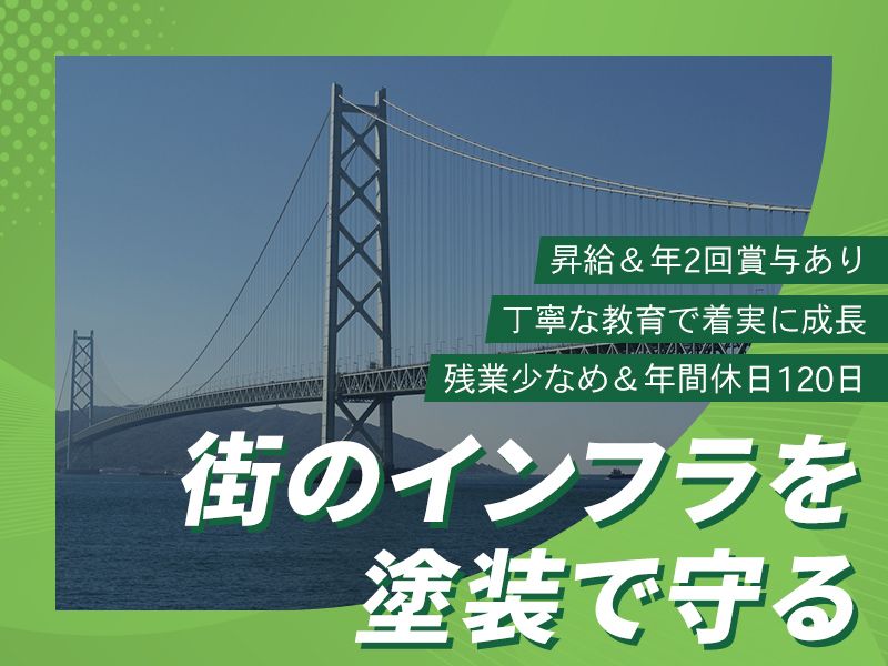 仕事内容 …求人のPOINT……………………… ✨20~30代が活躍中! ✨昇給&年2回賞与あり! ✨丁寧な教育で着実に成長! ✨残業少なめ&年間休日120日! ✨資格取得支援制度あり! ✨職場の雰囲気良好! ………………………………………… 【仕事内容】 各現場にて橋りょう塗装工事を お任せします。 そのほか、事務所で書類作成や 営業補助も担当していただきます。 ※出張あり ※直行直帰OK