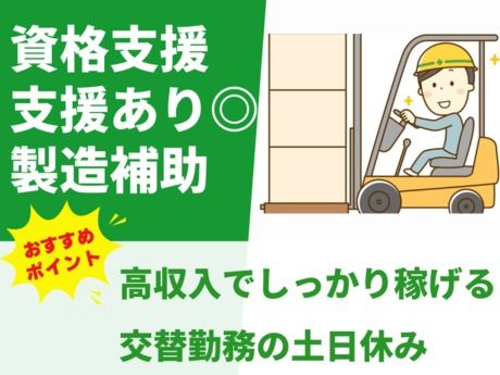 【保険制度】 雇用保険、労災保険、健康保険、厚生年金 待遇・福利厚生 【福利厚生】 ▼急な出費でも安心な希望日払い対応(規定あり) ▼社会保険完備(法定基準による) ▼交通費全額支給(規定あり) ▼無期雇用制度&キャリアアップ制度 ▼有給休暇制度 ▼退職金制度(規定あり) ▼定期健康診断 ▼各種通勤手段有(就業先による) ▼制服貸与 ▼屋内原則禁煙(喫煙室あり)※就業先により異なる grop・製造/工場/配送 #フォークリフト