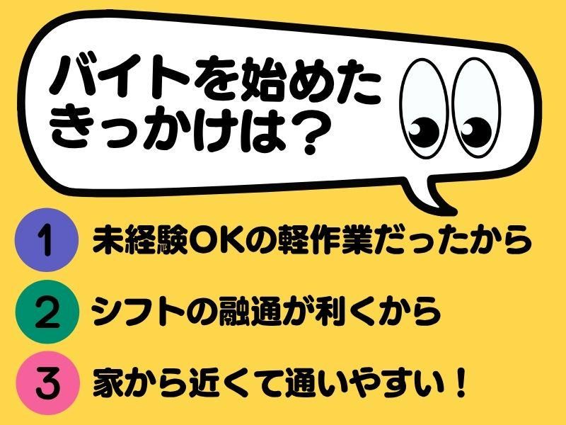 仕事内容 \事業拡大に伴う増員募集!/ シフトの相談OK♪柔軟に対応! 平日のみ希望の主婦(夫)さんや 土日メインの学生さん、 フル勤務のフリーターさんなど みなさん大歓迎ですよ٩(ˊωˋ*)و✧*。 ┏━━━━━━━━━━━┳━━┓ ┃ ポチっとクリック♬ ┃応募┃ ┗━━━━━━━━━━━┻━━┛ シンプル・簡単な軽作業です!  ̄ ̄V ̄ ̄ ̄ ̄ ̄ ̄ ̄ ̄ ̄ ̄ ̄ ̄☆* ̄ ̄ 商品が並んでいる棚へ行き ハンディ端末で対象商品をピッ! その後商品を集めるピッキング作業! ペット用品を扱っているので 重いものもありません!! 現在活躍しているスタッフも ほとんどが軽作業未経験✨ もちろん、仕分けや梱包、 入出庫作業、軽作業、倉庫作業 工場内作業、物流倉庫、 フォークリフトなどの 経験を活かすこともできますが、 必須ではありませんので 安心してご応募くださいね(*˘︶˘*)。・*✧ 働き方の相談OKです!  ̄ ̄V ̄ ̄ ̄ ̄ ̄ ̄ ̄ ̄ ̄ ̄ ̄ ̄☆* ̄ ̄ 平日のみや土日のみ、 フル勤務希望などがありましたら 面接の際に遠慮なく言ってください♪ 平日子どもや幼稚園や保育園、 小学校に行っている間に 扶養内で働きたい主婦(夫)さんや 平日は高校・部活があるから 土日だけ勤務の学生さんなど、 ライフスタイルに合わせて働けます♬ 主婦(夫)スタッフさんより一言✍  ̄ ̄V ̄ ̄ ̄ ̄ ̄ ̄ ̄ ̄ ̄ ̄ ̄ ̄☆* ̄ ̄ 子育てもだいぶ落ち着いてきたし、 そろそろお仕事しようかな~ と思いながら求人サイトを見て ここに決めました! 子どもがいるので急な体調不良で お休みをいただくこともありますが、 みなさんとても優しく嫌な顔せず お休みさせていただいています。 家から近いことから応募しましたが、 仕事内容も難しくないですし コツコツと作業するのが苦でない方なら 活躍できるお仕事だと思います! 学生スタッフさんより一言✍  ̄ ̄V ̄ ̄ ̄ ̄ ̄ ̄ ̄ ̄ ̄ ̄ ̄ ̄☆* ̄ ̄ 高校に入学してまわりがアルバイトを 始めているものの部活があって 平日は厳しい…。 土日のみ勤務できるところも少なく いいところないかな~と思いながら 探している時に見つけました。 最初はピッキングの意味もわからず とりあえずで応募しましたが(笑) いざやってみると簡単でびっくり!! 夕方までの勤務なのも 自分の中では結構ポイント高いです!!
