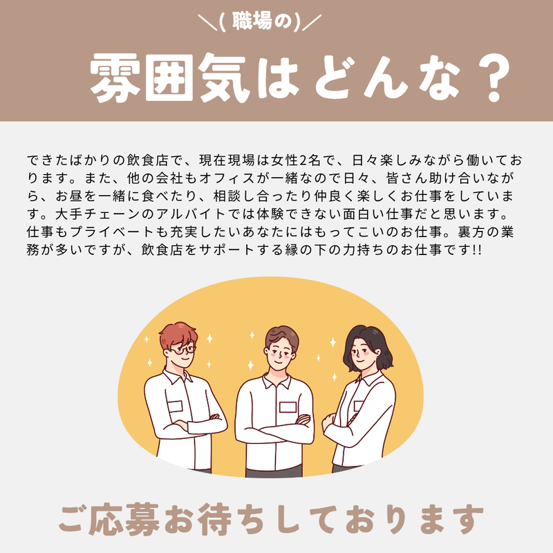 求めている人材 【必須】基本的なPCスキル(Excel/Wordの四則演算・関数)、正確な入力と期日順守、報連相が丁寧な方 【歓迎】飲食/小売の事務・在庫/原価管理経験、SNS運用や簡単なデザイン経験 【人物像】変化に柔軟で、必要時は現場応援にも前向き/段取りよく自走できる/数字と現場、どちらにも関心がある方