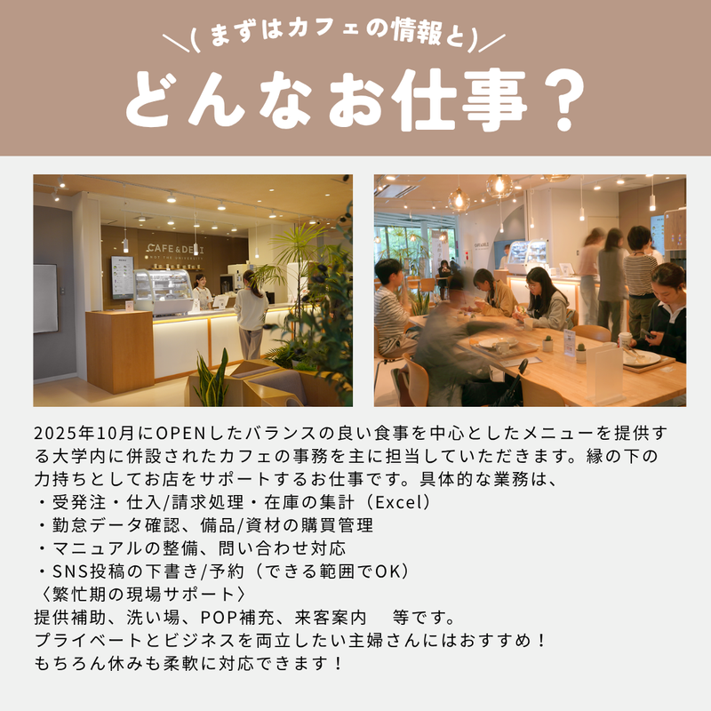 仕事内容 \\この求人のポイント// ✅主婦さん大歓迎! ✅未経験でもOK! ✅急な休みも取りやすい! ✅カフェも楽しめる!! ✅10:00~15:00の間から実働2~OK ――――――――――――――――――― ⏩お任せする仕事 ――――――――――――――――――― バランスの良い食事を中心としたメニューを提供する 大学内のカフェの事務を主に担当していただきます。 縁の下の力持ちとしてお店をサポートするお仕事です。 具体的には、 ・受発注・仕入/請求処理・在庫の集計(Excel/スプレッドシート) ・勤怠データ確認、備品/資材の購買管理 ・マニュアルの整備、問い合わせ対応 ・SNS投稿の下書き/予約(できる範囲でOK) 〈繁忙期の現場サポート〉 提供補助、洗い場、POP補充、来客案内 等 何事も親切・丁寧に教えるので、 未経験も安心してください。 ――――――――――――――――――― ✨休みも取りやすいの嬉しいポイント✨ ――――――――――――――――――― 勤務時間は10:00~15:00の2~4時間 (時間はご自由にご相談ください) 午後の時間を自由に使えるので、 プライベートとの両立も可能です。 急な休み等にも柔軟に対応できます 家庭もビジネスも両立!!