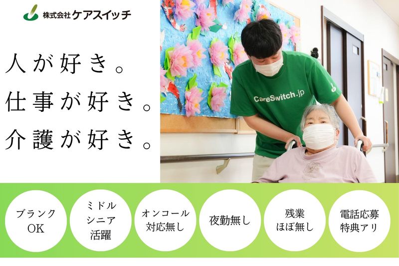仕事内容 ★*.─────────────.*★ ✅アピールポイント! ✦日勤のみ!(夜勤なし)で オンコール対応なし ✦ブランクOK!研修制度も充実 ✦お子様連れ出勤可能(条件あり) &希望休の取得配慮 ★*.─────────────.*★ *\お電話での応募が一番スピーディー!/* *⭐電話応募の特典有り⭐* ━━━━━━━━━━━━━━━━━━━━ 電話応募から「面接に繋がった方限定」で、 プリペイドカード500円進呈中! 今すぐお電話を! ▷ 0270-61-6555 直接応募者の方とお話できる機会を 重要視しており、電話で直接いただける ご応募を大切にしています。 *<お電話の際、こうお伝えください>* 「求人を見ました、〇〇と申します。 採用の件でご連絡いたしました。」 まずはこれだけでOKです! ✅ 時給1,300〜1,500円 ✅ 週2日〜/1日4時間〜OK ✅ オンコール・夜勤なし ✅ 車通勤/無料駐車場 ✅ ブランクOK・60代活躍中 *⭐仕事内容⭐* ━━━━━━━━━━━━━━━━━━━━ ・バイタルチェック ・処置、服薬管理 ・往診医師との連携相談 ・個別機能訓練 ・介護業務全般 └ 食事 └ 入浴 └ 排泄等の介助 など 【施設について】 デイサービスセンター(定員20名) 住宅型有料老人ホーム(全個室で20室) デイサービスセンターでの勤務です。 ⏩株式会社ケアスイッチについて⏩ ━━━━━━━━━━━━━━━━━━━━ 群馬県を中心に5つの施設を運営して おります。 設立以来、増益増収を続けており、 安定した経営基盤があります。 入居者様が日々満足な生活が送れるよう 私たちはトータルで支援しております。