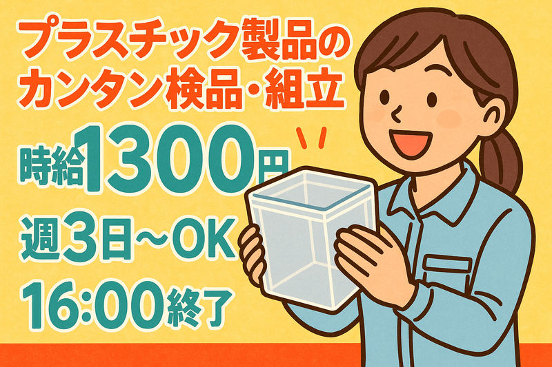 仕事内容 \令和8年3月末までの短期★人気の軽作業!/ 空調完備のキレイな倉庫で樹脂製品の検品・組立スタッフ募集! 「未経験OK」「週3日~」「16時終了」 プライベートと両立しながらサクッと働ける人気の軽作業です♪ 扱うのは軽いプラスチック製品だから、体への負担も少なめ◎ キレイ&快適な倉庫で、男女問わず幅広い年代が活躍中! <お仕事内容> 透明なプラスチックの箱をチェック&組立するシンプル作業です。 1日の流れはとってもカンタン! 【1】 箱にキズや汚れがないかを目視でチェック 【2】 商品を入れる 【3】 箱をパチッと組立てる(閉じるだけ) この3ステップの繰り返しだから、すぐに覚えられます! 立ち作業ですが、重量物は一切ナシ◎ <ここがポイント> ✅ 経験・資格いっさい不要! 初めての方も安心して始められます。 ✅ 16:00までの時短勤務! 家事や育児との両立もラクラク♪ ✅ 週3日~OK!曜日相談OK! 自分のペースで無理なく働けます。 ✅ 快適環境! 冷暖房完備のキレイな倉庫で年中快適! <こんな方にピッタリ> ・短期でサクッと稼ぎたい方 ・コツコツ・モクモク作業が好きな方 ・接客が苦手で裏方ワークを探している方 ・久しぶりの職場復帰を考えている方 \「やってみたい!」その気持ちだけでOK!/ 応募理由は“ちょっと気になる”で十分です。 まずはお気軽にご応募・お問い合わせください♪