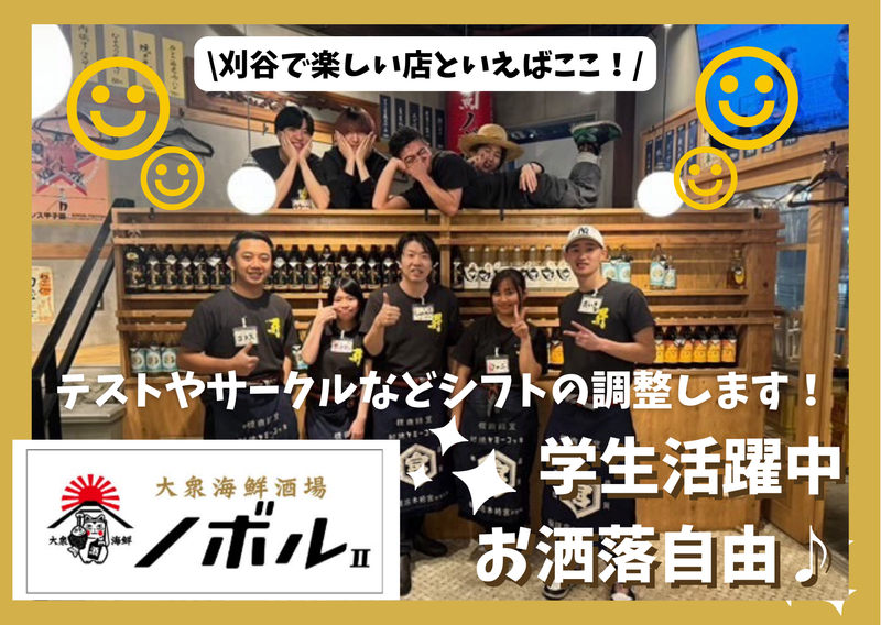 仕事内容 ******おすすめポイント****** ★駅近で通勤ラクラク◎ ★髪型・髪色自由! オシャレも楽しんで働ける♪ ★週2日~OK! 授業が決まった後シフト変更随時OK ★未経験歓迎!バイトデビュー応援します♪ ******************** / 刈谷で人気の 大衆居酒屋「NOBORU」2店舗目が オープン!! 一緒にお店を盛り上げてくれるスタッフ 募集! \ 大衆海鮮酒場での キッチン業務をお願いします。 <具体的には> ◎店舗開店準備(簡単な清掃) ◎盛り付け ◎仕込み ◎調理 ◎洗い物など ※状況によりホール業務をお手伝い 頂くこともあります ■まずは簡単な業務からスタート! ゆっくり仕事を覚えてもらえれば 大丈夫です◎ 飲食未経験の方、バイトデビューの方でも 安心して働けるよう、 先輩スタッフが丁寧に教えます♪ 分からないことは何でも聞いて ください! ■髪型・髪色自由! 「オシャレも我慢せずに働きたい」 そんな希望もここならOK♪ 自分らしさを出して働いてくださいね! ■駅チカで通勤便利! 学校帰りなどにサクッと稼げる。 車通勤OK◎交通費規定支給! 【先輩インタビュー】 「学生歓迎」「未経験OK」などの条件で 働きやすい職場を探していました。 未経験からのスタートでしたが 先輩スタッフが丁寧に教えてくれるので すぐに慣れることができました。 「駅チカ」なのも嬉しいポイントです! 【会社について】 私たちの仕事は、飲食を通じて関わる 全ての人を楽しませ、社会を元気にすること をモットーにしています! 自分の仕事を楽しむことで人生を 明るくし、未来を想像することで 希望を抱くことができます。 また、自分の情熱を燃やし続けることで 周囲に活力を広げ、前向きな姿勢で 仕事に取り組むことで、地域を活性化します。 このような企業理念を胸に、 私たちは日々、仕事に邁進しています! <事業内容> 大衆海鮮酒場、居酒屋
