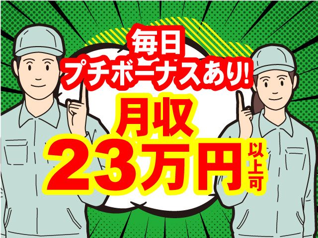 仕事内容 自動車部品を製造している工場になります。 <お仕事内容> 1.機械から部品が出てきます。 2.出てきた部品を目視で傷や へこみがないかを確認します。 3.部品を袋に詰め、一定の量を詰めたら箱に入れます。 製造業未経験の方がほとんどです。 先輩が必ずついてしっかり教えてくれるので 心配いりません! 男性女性両方が活躍しています! <お仕事の特徴> ・未経験の方が多数活躍中の職場です! ・簡単な仕事内容なので製造初めてでも安心! ・20~40代の男女活躍中!同世代が多く楽しい! ・休憩室は電子レンジ・自動販売機など設備充実! ゆっくり休めます! ・丁寧な作業を行うことが好きな方活躍中 プチボーナスで稼げる! 日勤1回につき500円、 夜勤1回につき1,000円の手当がつきます! 出勤率が良ければ1月あたり15,000円ほどつきます! こんな方も活躍中! ・製造業や工場勤務が初めての方 ・安定した職場で安定した収入を得たい方 ・仕事もプライベートも充実させたい方 ・「派遣は初めて!」 「アルバイトしか経験がない…」という方や 「正社員で働くのはちょっと不安」という方 ・製造業に興味を持っている方も ・モノづくりに興味のある方 まずはお気軽にお問い合わせください!