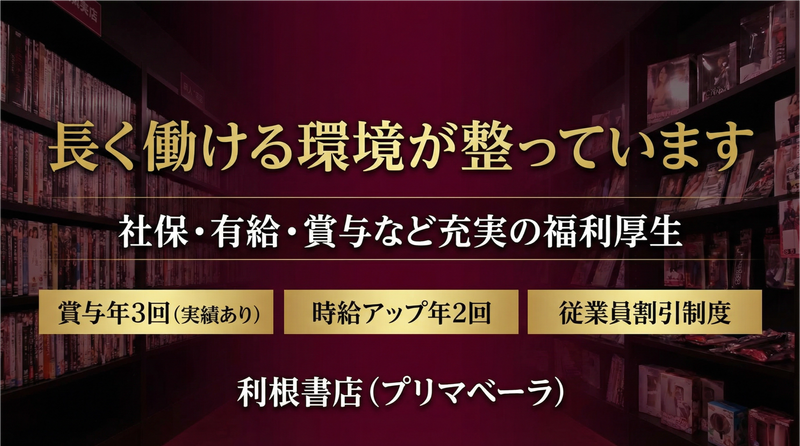 仕事内容 【この求人のポイント】 ✅ レジ・接客・販売が中心のお仕事♪ ✅ 未経験歓迎!マニュアル完備で安心スタート ✅ 社保・有給・賞与など、長く働ける福利厚生が充実 ✅ 落ち着いた店内で、丁寧な接客ができる環境 【会社について】 利根書店(プリマベーラ)は、 漫画・書籍・メディア商品を扱う店舗として、地域のお客様に長く親しまれてきました。 スタッフ一人ひとりが無理なく働けるよう、 教育体制やマニュアル、待遇面を整え、長期就業を支えています。 【当社の強み】 ✅ 従業員割引制度あり(販売・買取・レンタルなど) ✅ アルバイト賞与年3回(実績あり)/時給アップ年2回 ✅ 社会保険完備・社員登用あり ✅ 接客業未経験からスタートしたスタッフが多数活躍中 ✅ 長く働くスタッフが多い、安定した職場環境 【募集背景】 業務量の増加および体制強化のため、 レジ・接客・販売を中心に担当していただける店舗スタッフを募集しています。 お客様対応をメインとしながら、 店舗全体を支える役割として活躍していただきます。 【仕事内容】 店舗スタッフとして、 レジ対応・接客・販売業務を中心にお任せします。 まずはマニュアルに沿ったレジ業務や接客対応からスタート。 慣れてきたら、売場づくりや商品紹介などにも少しずつ関わっていただきます。 【具体的には】 ・レジ打ち、会計対応、簡単なご案内対応 ・お客様への商品説明・接客対応 ・売場での商品補充・陳列サポート ・POPの貼り替え、売場の整理整頓 ・日報入力(PC・スマホで簡単操作) ※専門知識は不要。 ※販売・接客の基本から丁寧にお教えします。 【1日の流れ(例)】 09:15 出勤・朝礼 09:30 レジ対応・接客・売場チェック 12:00 休憩 13:00 接客・販売対応/商品補充・日報入力 17:30 引継ぎ・片付け → 退勤 【社員インタビュー】 Aさん|入社2年目(売場づくり担当) Q. 入社の決め手は? 接客がメインで、落ち着いた環境だったことが決め手でした。 Q. やりがいは? お客様との会話の中でおすすめした商品を手に取ってもらえた時です。 Q. 職場の雰囲気は? 先輩が丁寧にフォローしてくれるので、接客未経験でも安心でした。 Q. 応募者へ一言 人と話すことが好きな方なら、きっと楽しく働けると思います。 【月収例】 時給1,070円 × 8h × 週5日 = 約171,200円/月 ※勤務日数・時間により変動あり 【キャリアパス】 アルバイト → 店舗リーダー → 正社員 → エリアマネージャー ※接客・販売経験を活かしてステップアップ可能 【先輩スタッフの前職例】 接客販売/コンビニ/書店/飲食店/イベントスタッフ/事務/フリーター など ※販売・接客未経験スタートの方が多数在籍