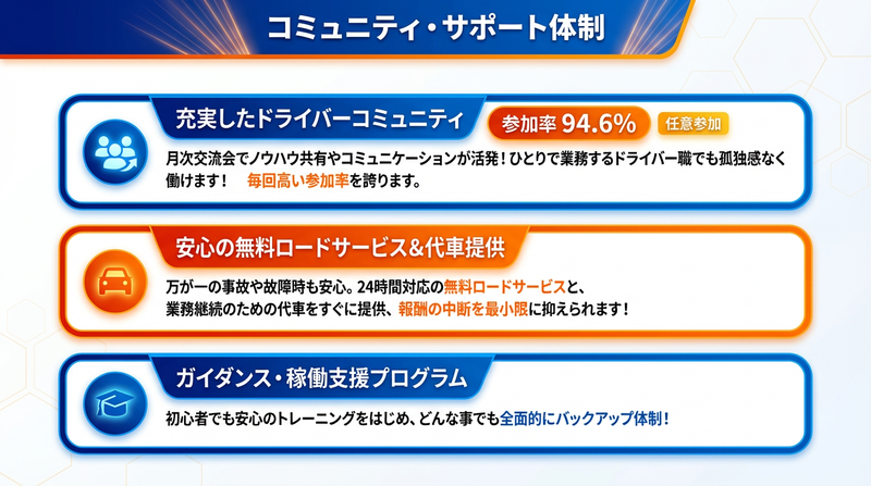 待遇・福利厚生 【福利厚生】 ━━━━━━━━━━━━━━━ 様々な福利厚生・制度をご用意! ━━━━━━━━━━━━━━━ ✨リース代実質無料 └週4・5日~稼働の人のみ ✨開業サポートあり(個人事業主) └初期費用ゼロで始められます! ✨ガソリンカード支給 ✨ロイヤリティゼロ! ✨無料ロードサービス+代車 ✨旅行のプレゼントあり! └過去には石垣島に行きました! ✨定期的な食事会 └任意参加ですが、参加率9割! ※もちろん強制はしません(笑) ✨リース車の休日使用OK