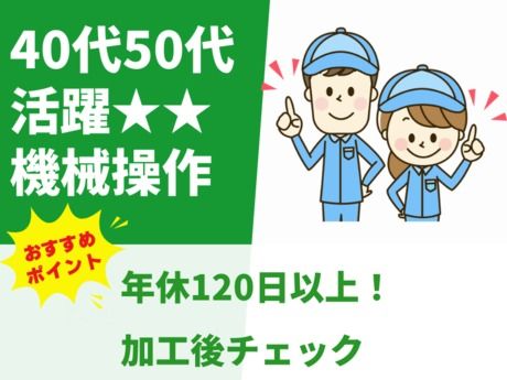 仕事内容 \ここがポイント/ ★年間休日120日以上で私生活も充実 ★40~50代の男性も活躍中! *・。・。*・。・。*・。・。* <仕事内容> 金属部品をマシンで加工する仕事です。 切削やレーザーでの加工が中心です。 ・機械に部品をセットする作業 ・マシンのスイッチを操作する作業 ・加工後の仕上がりチェック 業務内容は明確で変更もありません。 長期的に働きやすい職場です。 *・。・。*・。・。*・。・。*