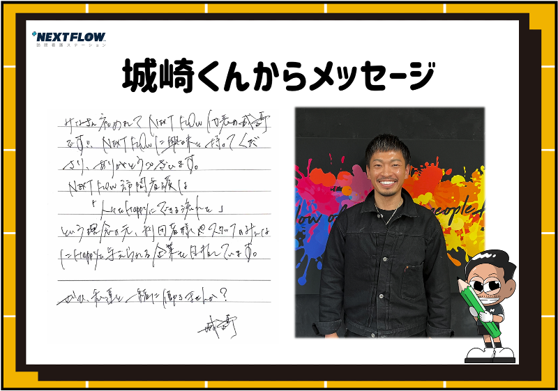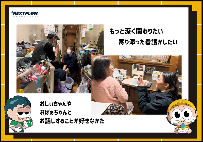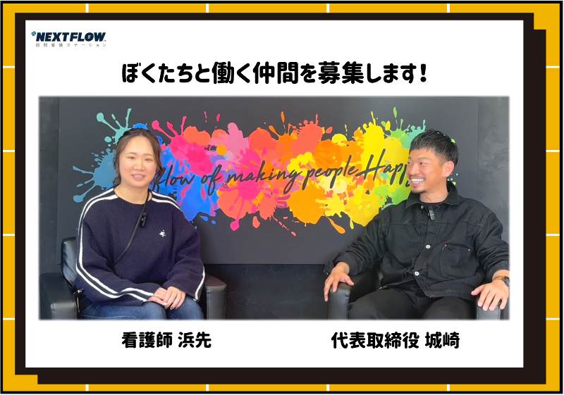 アピールポイント: NEXT FLOW 訪問看護が定義する 「本当の看護」とは 看護技術、医療知識、治療が中心ではなく 一人ひとりがこれからの人生をどう豊かに生きられるか 相手を知り、ニーズを把握し その上で看護師としての技術、知識をもとに生活を支援させていただく これこそが「本当の看護」だと私たちは定義しています。 看護こそ最高のサービス業です! ーーーーーーーーーーーーーーーーー