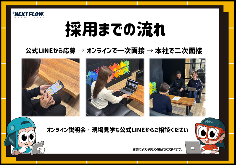 その他: <HP> https://next-flow.jp <Instagram> https://www.instagram.com/next_visiting_nursing 「まずは話だけでも聞いてみたい」という方、 ZOOMでの会社説明会も行っています! 各SNSのDM、またはお電話でもご連絡ください! 雇用形態: 正社員 給与・報酬: 300,000円 - 500,000円 月給 平均所定労働時間(1か月当たり): 160時間 資格と免許: * 看護師免許または准看護師免許 (必須)