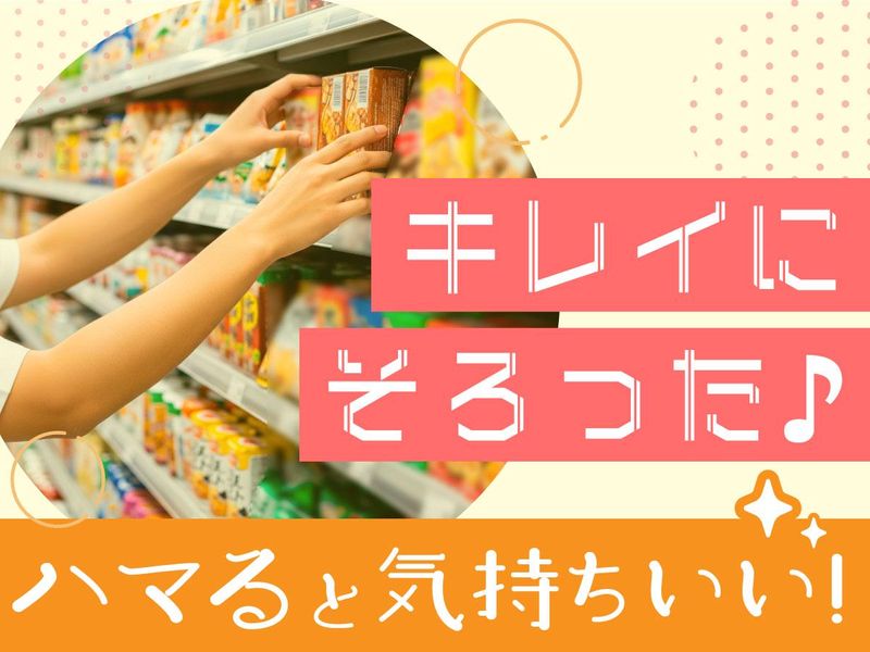 仕事内容 商品が売れた後の売り場棚の"凸凹”。 ポテチの袋が倒れてる。 ん~~~気になる…。 そんなあなたに天職かも◎ 人と話さず、コツコツ・モクモク。 きっちりハマると嬉しい。 この爽快感にハマったら、抜け出せない。 ただただ、並べるだけのお仕事です。 ━━━━━━━━━━━━━━━━━ 【 お任せするのは… 】 ①商品が入った箱を開ける ②決められた棚に並べる ③キレイに見えるように整える ▼ ▼ ▼ ▼ ▼ ▼ たったのコレだけ! お菓子やパンなどの食料品・飲料を、棚に陳列するだけ! 難しいことは一切ありません◎ ━━━━━━━━━ ◎オシゴトPOINT◎ ━━━━━━━━━ 【★】裏方だからほぼ接客ナシ! 「接客はニガテだな…」という方も安心のコツコツ・モクモク作業◎自分の作業に没頭したい方にもおすすめです! 【★】お店づくりが楽しい! 新商品が入荷したら目立つように並べたり…ご希望次第で、あなたのアイデアでお店を彩ってもOK!! 自分の並べた商品が売れていくと楽しいですよ♪ 【★】研修しっかり! 並べていく場所も順番に覚えていけばOK! 難しくないので覚えやすく、1週間くらいで慣れているスタッフさんがほとんどです。
