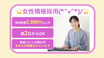 仕事内容 せっかく働くならあなたの 大好きなピアノで 創業17年、埼玉県を中心に ピアノやギターの音楽教室を2店舗展開、 17年間で合計2,000人以上の生徒様を サポートしてきた弊社ジーアンドイーが 運営するピアノ教室の講師さんの募集です⭐ 弊社では「いきなり面接」ではなく、 会社のことや不安なことなど 書類不要で選考前にざっくばらんに お話できる「カジュアル面談」を 実施していますので お気軽にご応募ください。 *✧₊⁎ ⁎⁺˳✧༚*:.。⁎⁺**✧₊⁎ ⁎⁺˳✧༚*:.。⁎⁺* *\働きやすさが魅力!/* レッスンスケジュールも 教室のスケジュールを 元に講師自身が生徒様と 調整するため融通が効く環境です◎ *\指導未経験から人気講師になれる!/* *SNSや動画サイトなどで 活躍中の20代30代や 指導未経験の方もサポート体制が あるので安心して勤務いただけます* 《アピールポイント》 ⭐教室はカフェ併設のアトリエ風の 綺麗な職場 ⭐週2日からOK・扶養内勤務可能 ⭐土日のみなど柔軟なシフト相談 ⭐ジャンル問わず・様々なコースあり ⭐生徒様は小中学生から大人の方まで様々 ⭐レッスンは生徒様の個人を 尊重した指導方針 ⭐副業OK・WワークももちろんOK ⭐*アーティスト業務希望*の 方には演奏依頼も ⭐頑張りを反映 *昇給制度&表彰制度あり* *✧₊⁎ ⁎⁺˳✧༚*:.。⁎⁺**✧₊⁎ ⁎⁺˳✧༚*:.。⁎⁺* ✧˖°-✧˖° ⭐《こんな教室・コンセプトです》⭐ ✅*【教室の雰囲気】* 北浦和駅から徒歩10分、 南与野駅徒歩10分、閑静な住宅街にある 「カフェ併設のアトリエ風」の教室です。 落ち着いた空間に絵画などで囲まれた アートな空間・おしゃれな内装、 空間と音楽の調和を楽しめるような 教室です。 ✅*【コンセプト・ジャンル】* ・クラシックコース ・ポピュラーコース ・ジャズ・ピアノコース ✅*【生徒様について】* 年少〜中学生から大人の方まで様々です。 どちらかというとガチガチの英才教育 熱血指導型のスクールではなく、 *生徒様のなりたい未来に向かって* *個人の尊重に重きを置いた指導方針* 一人の生徒様は原則、 同じ講師となる担任制です。 ✧˖°-✧˖° ⭐*《お仕事詳細》*⭐ ・ピアノレッスン (得意なジャンルを尊重します) ・生徒様の管理業務 ・楽譜などの資料作成 ・イベントや演奏会などの運営補助 - 「標準バイエル」「ブルグミュラー」 「ツェルニー100番」などの 初心者向けのテキストを ご自由に選択いただけます! その他、生徒さんの希望に応じ 「アニソン」などの楽曲も 教えることがあります* クラシック・ポピュラーなど ご自身の得意な分野を レッスンできます。 個人レッスンなので生徒様の ペースに合った計画で 進めてください。 はじめは既存の生徒さんを 担当していただくので、 すぐにレッスン可能です! 生徒様の管理業務はPCや スマホ・タブレットを使用、 レッスン出欠や月謝の 入金状況の管理などの 管理業務になります。 ✧˖°-✧˖° ⭐*《動画サイトで動画公開中!》*⭐ https://www.youtube.com/watch?v=RRIGvFv3RyE 教室内の雰囲気・一緒に働く仲間も 見ていただけたらと思います! ✧˖°-✧˖° ⭐*《ワークライフに合わせた働き方》*⭐ ✅*【扶養内勤務・Wワーカーの方へ】* レッスンは教室の開講スケジュールを元に 講師自身が生徒様と調整するため ライフスタイルに合わせることが できます。 扶養内勤務やWワークも可能ですので 自分の時間も家族との時間も しっかりと両立できます。 ✅*【音楽活動中の方へ】* 弊社では音楽教室の運営以外にも CD制作・制作出版・番組イベントの 運営など音楽事業を網羅しています。 イベントや演奏依頼・出版物の監修や 作成、TVやラジオ出演など弊社に 依頼があった業務は本人のご希望と 適性に応じて経験できる環境です。 もちろん別途インセンティブも 支給されるので経験と給与の 両立が可能です⭐ ✧˖°-✧˖° ⭐*《こんな先輩スタッフ活躍中》*⭐ ✅*【先輩スタッフ・40代女性Aさん】* 国立音楽大学器楽科ピアノ専攻卒業後、 渡米。ジャズ・ピアニストとして 15年間音楽活動を続け、米国にて 私立高校音楽科教員を10年間勤務。 教育と音楽経験を武器に活躍中の主婦さん⭐ ✅*【先輩スタッフ・30代女性Bさん】* 武蔵野音楽大学 音楽学部 器楽学科卒業。 自身の演奏活動の傍ら、教育活動にも 力を入れ、これまでに300人を超す 生徒さんのレッスンと向き合いながら 活躍中の女性⭐ ✅*【先輩スタッフ・30代女性Cさん】* 埼玉大学教育学部音楽専修(作曲専攻) 卒業。埼玉大学大学院教育学研究科 (ピアノ専攻)修了。 卒業後は市内小学校音楽専科教師として 8年間勤務し、様々な教育現場で活躍した 経験を活かして活躍中の女性⭐ ✧˖°-✧˖° ⭐こんな方からのご応募お待ちしてます⭐ 業務委託や出来高制での給与で レッスン自体が減少して 収入が安定しない環境を変えたいと お悩みの方 アーティスト活動の傍ら、ご自身の 未来につながるような仕事、職場で スキルをさらに磨いていきたい方 音楽系の学校卒業、会社員や保育士を 
