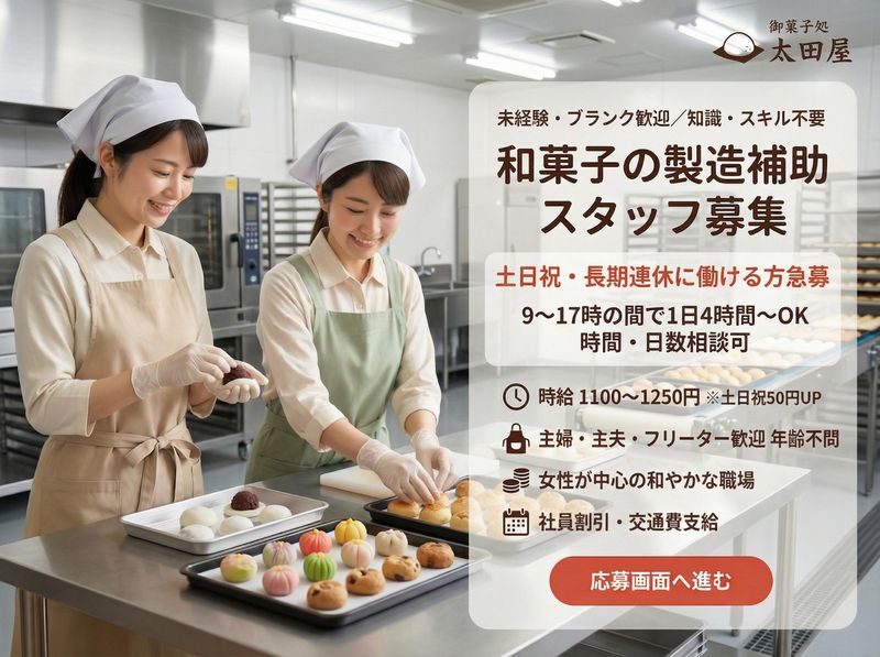 仕事内容 / 土日祝日・長期連休に 働ける方大募集♪ \ ✨未経験歓迎!特別な知識やスキル不要! ✨お菓子の製造補助・包装のお仕事◎ ✨初めての方でも覚えやすいシンプル作業 ✨9~17時の間で時間・日数相談OK! 【お仕事内容】 季節のお菓子を丁寧に作り、 お客様へ笑顔でお届けするお仕事です♪ 【具体的には…】 ⏩メインで作るスタッフのサポートが中心! └和洋菓子の製造補助 └商品の包装作業 など ★特定業者への配達もあり! ╭───────────────╮ ✨未経験でも安心して始められます ╰V──────────────╯ スキルや経験に合わせて、 できることからお任せしていくので、 「お菓子づくりなんてやったことがない…」 そんな方でも大丈夫です! 先輩スタッフが丁寧に教えるので、 基礎からしっかり身につけられます◎ 焦らずマイペースに成長できる環境です♪ また、年齢や意欲に応じて、 担当する業務の幅も柔軟に 調整することが可能です! ╭─────────────╮ ✨季節を感じながら働ける職場 ╰V────────────╯ 四季折々の和菓子を手がける中で、 日本の伝統文化を身近に感じながら 働くことができます✨ 「ものづくり」が好きな方にも きっと楽しんでいただけるお仕事です。 ╭────────╮ ✨御菓子処 太田屋 ╰V───────╯ 慶応元年に創業し、 長く地域に親しまれてきた 老舗和洋菓子店です♪ 伝統の味わいを大切にしながらも、 新しいお菓子づくりにも丁寧に向き合い 幅広い世代に愛される 品々をお届けしています。 お店には穏やかな空気が流れ、 ほっと心が和むような雰囲気が魅力です!