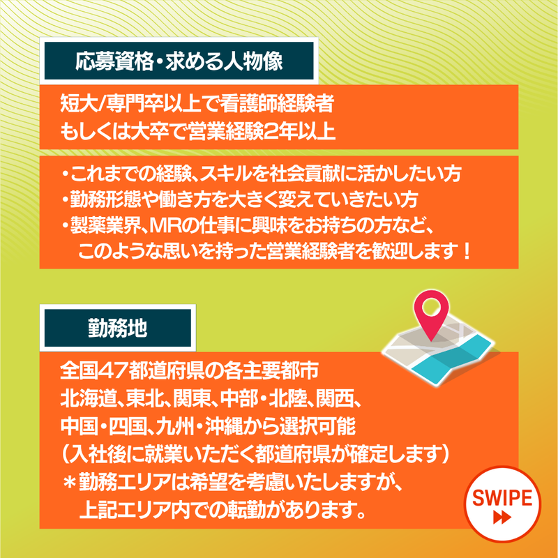 仕事内容 救急救命士として活躍する20代・30代の "未経験を対象とした、 未経験MRの募集です。 「学習への不安」や「業界ルールへの懸念」 を払拭する万全のサポート体制で、 あなたをプロフェッショナルへと育成します。 【この求人の特徴】 ★グローバル展開国数: 世界【約110】カ国、圧倒的な事業基盤 ★「勉強についていけるか不安」を 解消する、期間中の給与全額保証 ★業界特有の「公正競争規約」により、 接待・過度な付き合いは一切なし ★年間休日122日以上、 残業月平均【20】時間未満 ★新薬立ち上げ(ローンチ)に 関わるチャンスが【非常に多い】 ★入社3年目で年収600万円以上も可能 (年収UPを実現) ★充実の研修(約2ヶ月・320時間) ✅《具体的な業務内容》 製薬企業のパートナーとして、 担当する医薬品や医療機器の 適正使用情報を医療機関 (病院、クリニック)へ提供し、 普及させる活動を行います。 <担当領域(例)> 配属は適性や希望を考慮します。 ・オンコロジー(がん) ・糖尿病、循環器 ・呼吸器、自己免疫疾患 ・バイオ医薬品 ・医療機器(SR) など <主な訪問先> ・大学病院、基幹病院、クリニックの医師 ・薬剤師、看護師、医薬品卸など <1日の業務内訳(目安)> ・医療機関への訪問・情報提供:約60% ・訪問準備、学習(製品知識、論文読解): 約30% ・日報作成、社内ミーティング、事務作業: 約10% ※原則、直行直帰の営業スタイルです。 (配属先企業による) ※社用車(AT)を貸与します。 【アピールポイント】 ✅【膨大な知識学習への不安】▶ 「業務」として学びます 「ゼロから医学なんて無理…」 と思っていませんか? 入社後の導入研修(約【2】ヶ月)は、 仕事=学習です。 独学ではなく、プロの講師が カリキュラムに沿って教えます。 もちろん、この期間も給与は全額支給。 生活の心配なく、学ぶことだけに 集中できる環境を用意しています。 ✅【MR認定試験のプレッシャー】▶ 「合格させる」ノウハウがあります 私たちは「未経験者を合格させるプロ」 でもあります。 文系出身者も多数合格しており、 模擬試験や徹底した対策講座で、 あなたを合格ラインまで引き上げます。 ✅《転勤・勤務地に関する不安について》 現在の居住地+住んでみたい・働いてみたい 5都道府県を共有いただきます。 私たちは個人の事情を 最大限尊重することを約束します。 その後の異動についても、 年1回のキャリア面談などを通じて 本人の意向やライフイベント (結婚、出産、介護など)を 十分にヒアリングした上で決定します。 不安な点は、面接の場で 遠慮なくご相談ください。 ✅《万全の研修体制》→MRのお作法 入社後は約2ヶ月(320時間)の 手厚い導入研修をご用意。 膨大な医薬品知識や医療制度はもちろん、 PCスキル(Excel, PowerPoint)や、 MRのお作法・業界知識・常識部分を 専任講師がゼロから丁寧に指導します。 配属後も、上長との週1回の面談や、 OJT同行(配属後1ヶ月は週2回程度)など、 チーム全体であなたをサポートします。