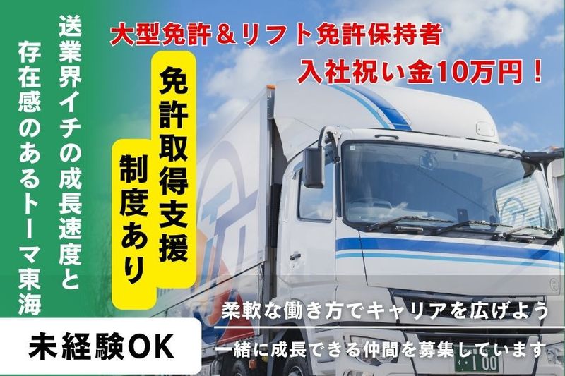 【仕事内容】 ✨業界屈指の成長企業【トーマ東海】で新しいキャリアを! 関西・関東エリアへ拠点拡大予定の、勢いある安定企業です。 普通免許があれば未経験の方もOK!免許取得支援制度で、中型・大型・リフト免許の取得もしっかりサポートします。 \ここで働くおすすめポイント/ ■月給28万円以上!経験を高く評価いたします! ■充実の手当&サポートで未経験から安心スタート ■免許取得支援制度あり ⏩️入社後の仕事の流れ 業務フローを先輩スタッフがレクチャーいたします。 その後必要な免許を取得後、実務をしていただきます ================== ✅従業員思いの福利厚生で安心スタート! ================== ⭐ 入社祝い金あり 大型免許&リフト免許保持者に10万円(規定あり) ⭐ 夏場はスポーツ飲料支給 凍らせた2Lを毎日支給! ⭐ 資格取得支援制度あり ・中型免許 ・大型免許 ・リフト免許 ・運行管理/衛生管理/危険物 など流通関連資格すべて対象 ⭐ 寮完備 家賃15,000円(光熱費込み)+駐車場代のリーズナブルな寮をご用意! ============ ✅業界一の成長速度と存在感 ============ 業界でも屈指の成長スピード! ・車両台数:230台 ・従業員数:210名 ・今後の展開予定:関西・関東・北陸エリア ⭕️平均年齢:38歳と若手中心 ⭕️女性ドライバーも多数活躍!女性管理職登用実績あり 【求人ID-MNT】