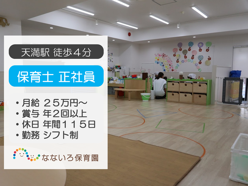 募集職種 保育士 仕事内容 0~2歳児における保育士業務 診療科目・サービス形態 認可外保育所 給与の備考 《月給》 250,000円~300,000円 ※試用期間中の待遇については、下記をご確認下さい。 《賞与》 年2回(6月・12月) 他に毎年2月に処遇改善費の支給あり 《試用期間》 ・入社後6カ月間は、試用期間となります。 ・試用期間中の賃金は、試用期間後の支給総額の97%支給となります。 ex.試用期間後に月給300,000円の場合、試用期間中は291,000円 ・試用期間中は契約社員となります。 想定年収 入社1年目:3,750,000円前後~ 入社1年目は前職の待遇やご経験等を考慮の上、決定します。 待遇 《一般的な福利厚生》 ・社会保険完備 ・通勤交通費全額支給 《両立支援に係るもの》 ・保育料無償制度…自社運営3施設、及び連携2施設の無償利用可 ・サンキューキッズ手当…年2回、子1名につき10,000円 ・昼食無料 《当社独自の考えに基づくもの》 ・ハッピーニュース手当…都度、10,000円~30,000円程度(祝事の内容による) ・バースデー手当…年1回、10,000円~30,000円 ・リファラル入社・紹介手当…社員からの紹介による入社で50,000円 ・永年勤続表彰制度…勤続5年で50,000円、10年で100,000円、15年で150,000円 教育体制・研修 ・社外研修へご参加頂く場合、内容により会社から全額又は一部補助あり ※経験年数や職位により、会社が指定するキャリアアップ研修の受講が必要になる可能性があります 長期休暇・特別休暇 ・夏季2日間(7月~9月末の希望日) ・冬季6日間(年末年始の指定日) ・法定通りの有給休暇 応募要件 保育士資格 歓迎要件 実務経験4年目以上(37カ月目)以上 選考プロセス 《応募の流れ》 ・ジョブカンフォーム(又は公式LINE)よりお問合せ下さい。 [1] ジョブカンフォームよりご応募下さい。 ↓ [2] 当社より、応募書類(履歴書又は職務経歴書等)のご提出を依頼します。 ※会社説明又は施設見学等については、面接と合わせて実施させて頂いております。 ↓ [3] 当社にて、書類審査を行い、通過者の方へ面接のご案内します。 ↓ [4] 事業所又はオンラインにて面接を行います。 ↓ [5] 当社より、採用決定のご連絡をします。 ↓ [6] 内定を承諾頂き次第、入職日を調整します。 募集拠点 同心なないろ保育園 大阪府大阪市北区同心2丁目5-16 岡本ビル1階