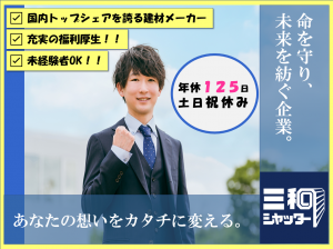 インフォメーション 半世紀を越え、時価総額1兆円の成長し続ける安定した企業で営業として活躍しませんか?研修制度でフォローも万全◎ _/_/_/_/_/_/_/_/_/_/_/_/_/ 営業として活躍する楽しさ、安定感、収入 どれもココで手に入ります! _/_/_/_/_/_/_/_/_/_/_/_/_/ アピールポイント シャッターといえば「三和シヤッター」! 社名だけで「あの会社か」と分かっていただけ る圧倒的な知名度があります。営業としても、 話が進めやすく、これから営業としてデビュー したい方にオススメの環境です! 近年、自然災害への備えに対する注目も集まっ ており、当社でも新製品を続々と世の中に 生み出しています。常にお客様の需要に合った 提案ができ、営業としての【やりがい】を感じ ながら活躍できます! ★軽量シャッターを普及させた確かな実績 三和シヤッター工業は、時代の先駆けとして 1956年(昭和31年)に誕生し、 半世紀以上の実績を積み重ねてきました。 設立以来、金属製で防災・防犯性に優れている 「軽量シャッター」は瞬く間に普及。 現在の国内No.1シェアに至ります。 求人No.KSI 自分力バロメータ コミュニケーション力 営業力 積極性