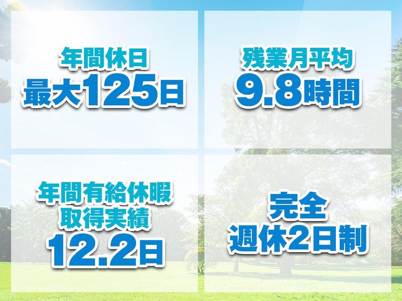 休日休暇 年間休日最大125日 完全週休2日制(土・日)/祝日/GW、夏季、年末年始 ※上記は、配属先のカレンダーに準ずる ・有給休暇(年間有給休暇取得実績:12.2日) ・産前・産後休暇 ・育児休業 ・介護休業 ・特別休暇 ・慶弔休暇