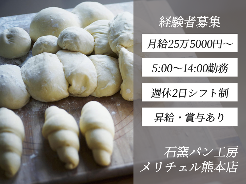 仕事内容 / 熊本で人気の石窯ベーカリー パン職人募集(実務経験3年以上) キャリアアップ・スキルアップ可能! \ 【仕事内容】 ・パンの仕込み ・パンの成型、焼成 ・調理パンの製造 ・これらに付帯する業務 入社後は、経験を活かして ・パンの生地づくり ・パンの焼成 ・パンの仕込み などのメイン業務をお任せします。 分からないことや気になることがあれば お気軽に質問、相談が可能ですので、 働きやすさは抜群です! <ライフプランに合わせたキャリアアップ> 成長に合わせてしっかりとキャリアアップが可能! スタッフ⇒店長⇒マネージャーなど、 あなたの頑張りを評価する体制を整えて お待ちしています♪