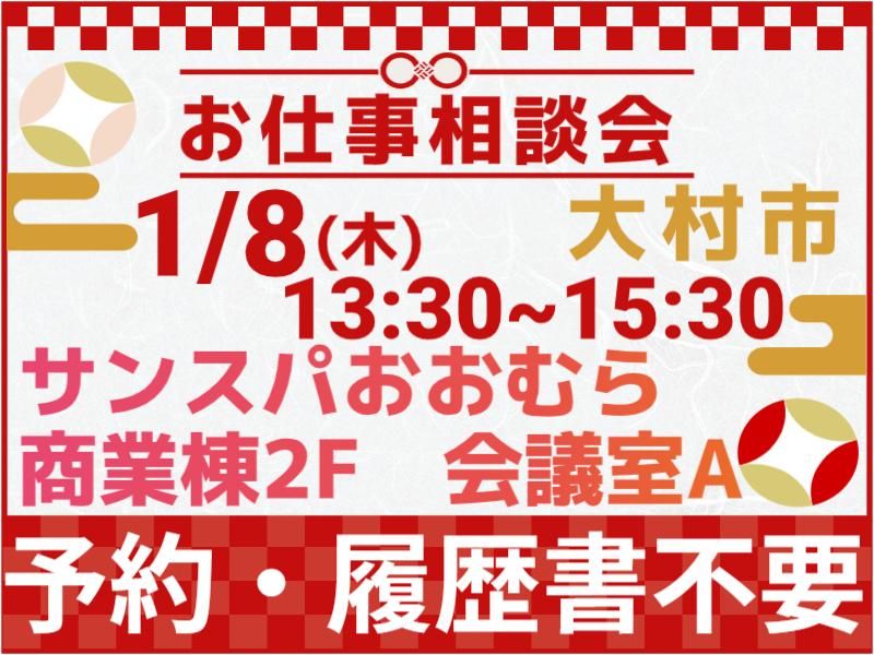 選考プロセス WEB・電話応募どちらでも受付中 ☎0120-68-2209 ■応募⇒⾯接⇒見学⇒採⽤ ※工場見学から3週間ほどで就業可 ※応募に相談会の参加必要なし 【お仕事相談会】 ※予約&履歴書不要︕服装も⾃由 ※希望者のみ事前説明いたします *1/8(木)13:30~15:30 【大村市】サンスパおおむら商業棟2F 会議室A *1/15(木)13:30〜15:30 【長崎市】メルカつきまち5F A1会議室 ―――――――――――――――――― 「日程が合わない…」という方もOK! 長崎事業所(諌早市栄田町)で随時、 お仕事のご紹介が可能です! まずは、お気軽にご相談ください! ――――――――――――――――――