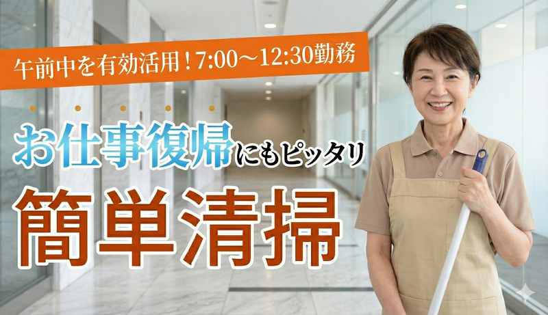 仕事内容 【お仕事のポイント】 大手企業本社の清掃業務! 普段ご家庭で掃除をしている方なら 誰でもできる「簡単で黙々」のお掃除のお仕事です♪ 作業は決まったエリアを分担して1人で作業します。 - 【POINT】 ★時給1,250円で効率よく稼げます! ★50代・60代・70代がメインで活躍中の定着率が良い職場! ★週2日~OK&1日5.5時間の短時間勤務 ★清掃業界未経験者も大歓迎!安心の作業マニュアルと先輩の丁寧な研修あり。 ★履歴書不要で気軽に応募OK! - 【具体的な仕事内容】 共有部清掃や事務所・食堂・更衣室の清掃をお任せします。 ◆玄関・廊下・階段のモップがけ ◆ゴミ回収 ◆トイレ・シャワー室・食堂の清掃 など ☆自宅から現場への直行直帰となります。 ☆作業マニュアルがあって未経験の方も安心して始められます! ☆自転車通勤・バイク通勤もOK!(ご相談ください) - 【教育について】 まずは先輩が1つ1つ丁寧にお教えするので未経験の方も安心してご応募ください。 - 【こんなアナタにピッタリ!】 ・ 健康維持も兼ねて身体を動かしたい方 ・家庭や趣味と両立したい方 ・Wワーク(副業)として午前の時間を活かしたい方 ・主婦(夫)さんや60歳以上のシニア ・朝の時間を活かしたい方 ・人と関わりすぎず黙々働きたい方 ・健康維持も兼ねて身体を動かしたい方 ・家庭と両立できる短時間パートを探している方