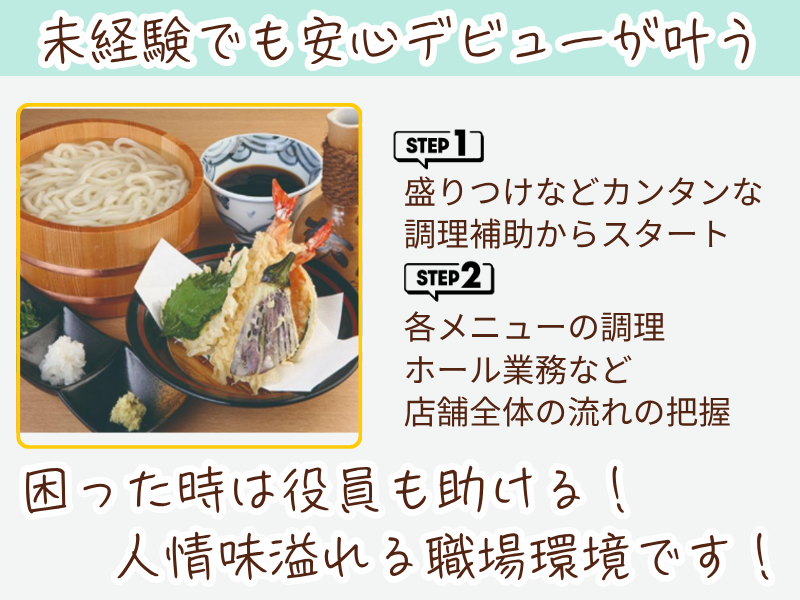 仕事内容 \男女ともに活躍中!「無理なく適度」に働ける/ ✅深夜勤務なし(ラストオーダー21時) ✅1日平均8hで残業ほとんどなし ✅賞与年2回+決算賞与 ✅通勤交通費全額支給 ✅転居を伴う転勤なし ✅調理補助からスタートで安心 ✅マニュアル完備&効率化を推進 当店では、 飲食業界の「ハードそう」というイメージを払拭! タッチパネル注文導入など効率化が進み、 体力的な負担を軽減しています。 仕事はもちろん、 プライベートの時間も充実できるような 働き方を目指している方にピッタリです。 困った時は役員も助ける人情味ある社風が自慢です。 また、特定技能資格をお持ちの方も応募可能です。 ※日本語能力試験N1相当の日本語力が必要となります。 【具体的なお仕事】 接客・調理などをお願いします。 ◆お客様の案内・配膳 ◆本格的な「生そば」「出汁」「天ぷら」 など素材の仕込み ◆レジ対応 ◆シフト管理 など 入社後は盛りつけなどカンタンな 調理補助からスタートしましょう。 徐々に各メニューの調理や ホール業務のサポート、 店舗運営の流れを覚えて頂きます。 タッチパネル注文も導入され、 仕入れなども取引先とシステム連携 されているなど効率化が進んでおり、 難しさはありません。もちろん マニュアルも完備されています。 この仕事のPOINT・・━━・・━━・・━━・・ ✨早番・遅番などシフト交代 ・・━━・・━━・・━━・・━━・・━━・・━ 1日勤務は平均8h程(変形労働時間) またラストオーダーは21時半、 22時閉店なので 遅番でも深夜勤務もないため、 無理なく適度に働けます! この仕事のPOINT・・━━・・━━・・━━・・ ✨働きやすい商業施設内の店舗 ・・━━・・━━・・━━・・━━・・━━・・━ お客様はファミリーから お年寄りまで幅広く、 お食事中心なので 11:30~13:30のお昼どき 18:00~20:00の夕食どき ピークタイムがはっきりと しているのも特徴です。 それ以外の時間は比較的落ち着いて 翌日以降の準備や後片付けをしたり、 順番に休憩を取ったりしています。 この仕事のPOINT・・━━・・━━・・━━・・ ✨ずっと現場スタッフでもok ・・━━・・━━・・━━・・━━・・━━・・━ 店長へステップUP希望はもちろん歓迎ですが 責任あるポストは不安って方は ずっと飲食店現場でホール・キッチンでもok ライフスタイルにあわせて働き方を 本人が選択できます。 この会社のPOINT・・━━・・━━・・━━・・ ✨長く安心して働ける会社 ・・━━・・━━・・━━・・━━・・━━・・━ とんかつ、ラーメン、中華、お好み焼き、 カフェのほか最近では冷凍食品まで。 景気や社会情勢に左右されない多彩な 業態で店舗を拡大。 70店舗、従業員1800名の安定企業! この会社のPOINT・・━━・・━━・・━━・・ ✨きらくの正社員を選んで良かった! ・・━━・・━━・・━━・・━━・・━━・・━ 貴方にそう言ってもらえるように、 ライフステージが変わっても、安心して 働ける環境がある飲食店でありたいと 思っています。 仕事はもちろん、プライベートの時間も 充実できるような働き方を目指している方に ピッタリの職場です。 お話を聞くだけでも構いませんので、 お気軽にご応募お待ちしています!