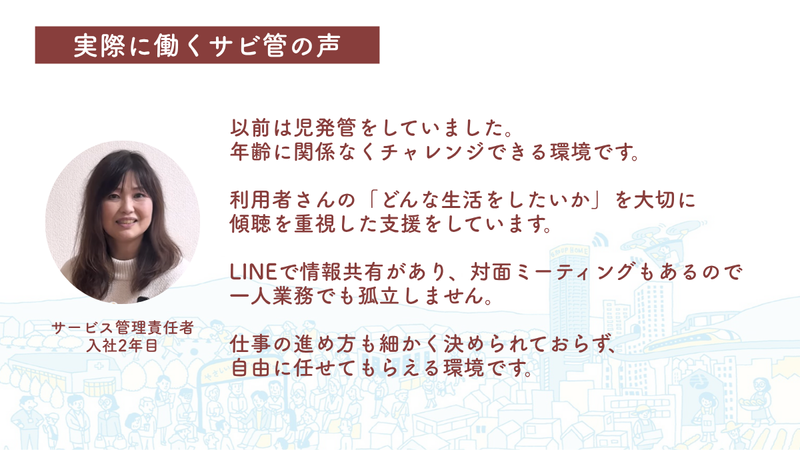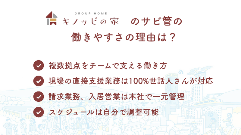 仕事内容 サビ管として、1人で抱え込んでいませんか? ・現場にも入りながら業務をこなしている ・シフトや調整業務に追われている ・相談できる相手がいない そんな働き方に違和感を感じている方へ。 キノッピの家では、利用者様を「サビ管チーム」で支える体制を整えています。 \🏡 働き方の特徴/ ・複数拠点を5~6名のサビ管チームで支える体制 ・定員4~7名の少人数施設で、一人ひとりに向き合える ・現場支援・夜勤なし ・請求/採用/シフト作成は本社が対応 ・残業はほぼありません \💡 キノッピの考え方/ 私たちは「サポート」を大切にしています。 利用者様のできることを増やし、 自立支援を目的とした関わりを行っています。 \👤 こんな方に向いています/ ・サビ管として孤立した経験がある方 ・先輩サビ管から学びながら成長したい方 ・業務負担に悩んできた方 ・チームで支援を考えたい方 ・無理なく長く働きたい方 \✨ 代表メッセージ/ 福祉の仕事は、専門職だけで完結するものではありません。 地域の中に少しずつ「関わる人」が増えていくことで、 やさしい社会は広がっていくと考えています。 <仕事内容> サビ管の仕事は、 利用者様一人ひとりの想いや生活に向き合いながら、 その人らしい暮らしを支える支援を考えていく大切な役割です。 利用者様が地域の中で安心して暮らし続けられるよう、 チームで支援を考えながら関わっていきませんか。 私たちと一緒に、 やさしい街づくりに参加していただけたら嬉しいです。 ご応募を心よりお待ちしています。 茨城県内にて複数展開している軽度障がいのある方向けの個別サポート付き住宅の「キノッピの家」にでサービス管理責任者業務を行っていただきます。 サビ管業務に集中できる環境です。 現場支援・夜勤はなく、請求・採用・シフト作成も本社が対応しています。 ■主な業務 ・利用者様との面談、アセスメント ・個別支援計画の作成 ・モニタリング ・ご家族・関係機関との連携 ・スタッフへの支援方法の共有、助言 ■働き方の特徴 ・現場での直接支援業務はありません ・夜勤なし ・請求業務、入居営業、シフト作成は本社が担当 ・5~6名のサビ管・管理者チームで連携しながら支援を行います ・先輩サビ管がいるので学びながら成長できます ・特定の拠点に固定されず、複数拠点をチームで支える働き方です ・スケジュールは自分で調整可能。無理なく支援に向き合えます ・1人で抱え込まず、チームで支援を進めていきます
