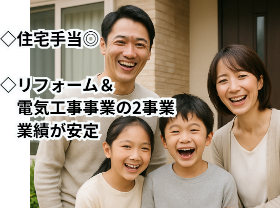 仕事内容 \未経験から入社したスタッフも資格を取得し活躍中!/ ■照明やコンセント、配線の設置およびメンテナンス ■火災検知器や警報装置の設置と電源配線工事 ■高圧電力を受け入れるための変圧器や受電設備の工事 ■電気設備の耐震補強や、地震対策としての配線の保護 当社が受託した各種電気工事をお任せします。 ▼簡単な募集内容▼ 【雇用形態】正社員 【給与】月収:25万円~35万円 【勤務時間】月~金 8:30~17:45 【募集要件】未経験の方大歓迎です 【その他】電気関係の資格をお持ちの方優遇 ★この求人のアピールポイント ■土日祝はお休みで残業は月10時間程度 ■リフォーム事業と電気工事事業で2事業で業績安定◎ ■関西電力の認定工事会社!問い合わせ&紹介が多数 ■年間賞与3か月分 住宅手当14000円アリ =============================== 【どんな会社?】 当社は地域に根ざした電気工事会社としてスタートし、現在では住宅設備事業と電気工事事業を中心に成長を遂げてきました。 私たちは、地元姫路から始まり、現在では加古川、神戸、大阪、名古屋と事業を展開しており、2025年3月には東京にも進出予定です。 住宅設備事業においては、関西電力グループから認定を受けたオール電化機器の専門店として、エコキュートや空調設備、キッチン、バス、トイレなど、幅広い商品を提供しています。販売から施工、そしてアフターフォローまで一貫したサービスを提供し、地域に根ざした丁寧な対応で、多くのお客様からリピートの信頼をいただいております。また、関西電力の認定工事会社として、確かな技術と信頼を基盤に、イベントや紹介を通じて安定的な顧客を確保しています。 【お仕事内容】 当社が受託した各種電気工事をお任せします。 具体的には・・・ ■照明やコンセント、配線の設置およびメンテナンス ■公共施設などで正確な時刻を表示するための設備工事 ■火災検知器や警報装置の設置と電源配線工事 ■高圧電力を受け入れるための変圧器や受電設備の設置工事 ■電気設備の耐震補強や、地震対策としての配線の保護 などなど 主に工場や事務所ビル、介護施設など、様々な現場の電気設備工事・保守・メンテナンスを行います。 ※ 現場は事務所から日帰りエリアです。宿泊を伴う出張はありません。 ※ 電気工事部の社員は現在10名、20代〜40代が中心です。 ★入社後について まずは当社社員と一緒に現場を回って頂きます。 仕事に慣れてきたら、出来そうな現場から担当をお任せしていきます。 基本的に1人で担当する現場が多いので、休憩時間や残業などは個人の裁量にお任せ。 「自分のペースで仕事を進めていきたい」「もくもくと1人で集中するのが好き」 そんな方にとっては働きやすい環境だと思います。 【会社の魅力】 ■未経験から入社したスタッフも資格を取得し活躍中! ■リフォーム事業と電気工事事業で2事業で業績安定◎ ■関西電力の認定工事会社!問い合わせ&紹介が多数 ■年間賞与3か月分 住宅手当14000円アリ 当社は、土日祝はお休みで残業は月に10時間以下です。プライベートを充実させながら働くことが出来る環境です。取引先は大手中心ですし、経営も安定しています。 設立から半世紀以上が経過し、安定した経営基盤を持つ当社では、20年、30年先を見据えた安心できる職場環境を提供しています。未経験から入社したスタッフが電気工事士や電気工事施工管理技士の資格を取得し、専門的な技術を身につけながら成長しています。資格支援や資格手当が充実していることも、社員が長く安心して働ける理由の一つです。 安定した企業で、腰を据えて長く働きたい方にはピッタリです。業務内容などに関しては、面接の中でしっかりとご説明させていただきますので、当社でのお仕事にご興味を持っていただいた方のご応募をお待ちしています。