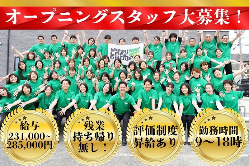 仕事内容 \10月新規OPEN!!/ ⭐正社員募集!日曜固定休&残業ナシ⭐ \イベント充実♪楽しく働ける職場!/ □■────────────────■□ 10月新規OPENいたしました 「みらいキッズ イオンモール佐賀大和」 児童発達支援事業所のオープニングスタッフ募集です♪ ※面接の前に『お仕事説明会』に参加して頂きます! 普段の子供たちの様子を動画にて視聴して頂き、 会社の立ち上げの経緯や支援内容についてもお話しします♪ 説明会日程:10/31、11/28、12/19(全日程19時〜) (その他の日程,時間でも個別で対応可能ですので気軽にご連絡ください!) MIRAI CARE GROUP本部:0952-20-3007(担当:北原) インスタ:『@miraicaregroup_recruit』のDMからでもOKです! →説明会後、半日現場に入って『職場体験』もできますよ♪ しっかり自分に合った転職先を考えたい人にオススメです✨ 予想を超える反響で待機児童多数につき 今後もエリア拡大予定! 佐賀市八戸、久留米市櫛原町、久留米市合川町、みやき町にオープン予定! 多機能事業所で心身の成長や発達に 心配のある未就学のお子様をお預かりします。 「運動療法」、「食育」、「成功体験」 の3つの柱で、子ども達の『生きる力』 である非認知能力の向上を目指し、 子どもたちの特性に合わせた 個別支援計画に基づいた支援を実施します。 □■────────────────■□ 【 仕事内容 】 ✅療育業務 ✅児童の送迎(社用車使用) ✅ご家族との連絡 ✅事業所内の雑務 ✅関係機関との連携 ✅イベント立案と準備 etc... 子どもたちと一緒に遊んだり学んだり! 元気に笑顔で関わってくれる方、大歓迎です♪ 「資格は持ってるけど、実務経験がなくて不安...」 そんな方も安心して就業していただけるよう 充実の教育体制を整えています! 基本的に入社から3週間で新人研修を行い、 その後は月に1回のペースで研修を行います。 その後も分からないことがあれば 先輩スタッフにいつでも聞いてくださいね♪ ♪:。・゜♪:。・゜♪:。・゜♪:。・゜ 【 当社の魅力ポイント 】 ✨ 週休2日制(日曜+他1日) ⇒ 今後も年間休日数増加予定アリ! ✨ 誕生日お祝いやBBQなど楽しいイベント多数! ✨ 充実の福利厚生! ✨ 明確なキャリアアップ制度有り ♪:。・゜♪:。・゜♪:。・゜♪:。・゜ 【 1日の流れ 】 ⏰ 8:30~ ミーティング ⇒ 当日行う支援内容の確認や 児童・保護者様の連絡事項等を共有します。 ⏰ 10:30~ 児童発達支援業務 ⇒ 運動療法や食育、成功体験の柱で支援を行います (例)...「運動療法」しっぽ取りゲーム、大縄跳び、サーキットトレーニング (例)...「食育」うどん作り、カレー作り、食材パズル、野菜スタンプ (例)...「成功体験」壁面制作、廃材遊び、お買い物学習 など → 16:30まで児童達と楽しく活動します。 ⏰ 12:00~ 利用児童昼食 ⇒ この時間でスタッフも交代で 1人60分の休憩を取ります。 ⏰ 13:00~ 午後の支援業務開始 ⇒ 子供たちの非認知能力の向上を 目指した活動を行います。 ⏰ 16:30~ 保護者お迎え、送迎開始 ⏰ 17:15~ ミーティング ⇒ 当日業務の反省や利用児童情報 の共有や保護者からの連絡事項の確認 送迎業務の確認を行います。 ⏰ 17:30 退勤 ⇒ 1日お疲れ様でした♪ ショッピングモールの中にあるので、 退勤後にお買い物を楽しむ...なんてことも可能です! 残業・持ち帰りは基本ありません! 【 当社について 】 2015年に夫婦で始めた小さな治療院でした が、現在約70名のスタッフを抱え、治療院と 福祉事業で地域に貢献する企業に成長しました。 代表の息子が重度の発達障害を持ち、適切な 放課後等デイサービスが見つからない経験 から、2022年に「みらいスイッチ神埼」を開設。 利用希望者が殺到し、2023年に4店舗、 翌年に3店舗を新設。 『適切な支援を受けられない子どもを0に』 『障がいを抱えている人が、親なき後 でも生まれ育った地域で安心して暮らせる 受け皿になる』 を目指し、挑戦を続けています。 今後、保護猫譲渡施設、訪問看護ステーション、 佐賀市八戸、久留米市櫛原町、久留米市合川町、みやき町に 児童発達支援事業所を展開予定です。 「応募ボタン」または下記までご連絡を! 電話:0952-20-3007(平日9:00~18:00) \もっと詳しく当社について知りたい方/ HP:「未来ケアグループ」 instagram:「miraicaregroup_recruit」で検索!