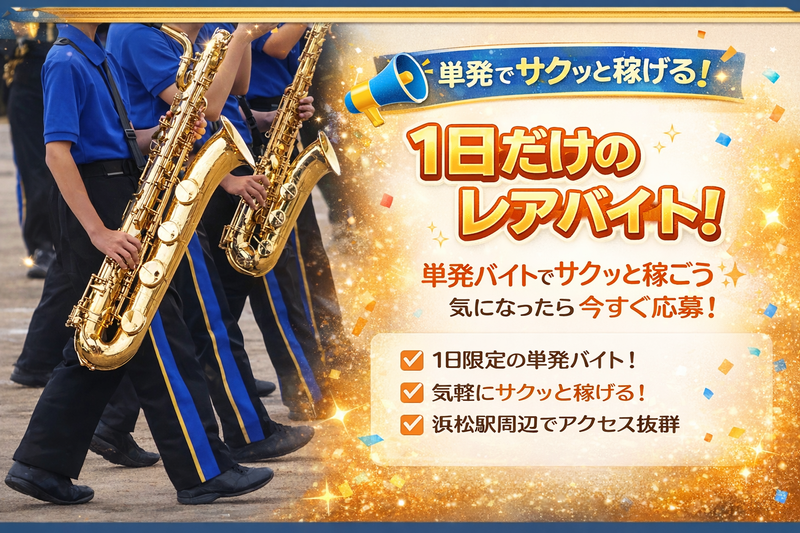 仕事内容 \ 単発◎高時給の短期バイト / 吹奏楽パレードの運営スタッフ大募集✨ 浜松まつりを支える人気のお仕事! ⭐5/3(日)限定!単発バイト ⭐午後から勤務で働きやすい! ⭐1日で7800円+交通費支給! ⭐未経験でも安心のシンプル業務 ――――――――――――――――――― <お仕事内容> ・来場者のご案内 →会場内の場所案内など ・誘導業務 →安全にパレードが進むようサポート ⭐難しい作業なし! 案内・誘導などシンプル業務中心 当日はチームで動くので安心! ⭐長時間ではないので 「初めてのイベントスタッフ」 という方にもオススメです! ▼勤務詳細 □ イベント:浜松まつり 吹奏楽パレード □ 会場:浜松駅北口周辺 □ 時間:14:00~20:00(予定) □ 給与:時給1300円(実働時間分支給) □ 交通費:公共交通機関実費支給 (上限2680円) ――――――――――――――――――― <こんな方におすすめ> ✔ 短時間でサクッと稼ぎたい ✔ イベントバイトに興味がある ✔ 人と関わる仕事が好き ✔ 友達と一緒に働きたい 学生さん、フリーターさん、 社会人の方など毎年様々な世代が活躍✨ ――――――――――――――――――― <服装・持ち物> 【服装】 ・華美でないトップス ・黒の10分丈パンツ ・華美でないスニーカー ※ビブス貸与あり 【持ち物】 ・飲み物 ・筆記用具 ・腕時計 ※食事の支給はありません 勤務前に各自で昼食をお済ませください 「ちょっと気になる」でも応募OK! ―――――――――――――――――――