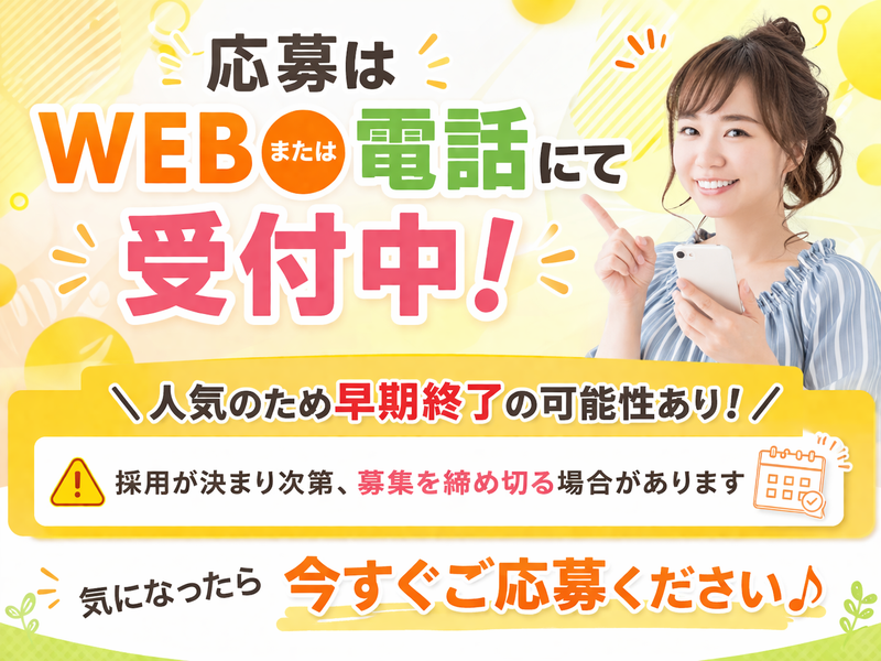 選考プロセス WEBまたは電話にてご応募ください。 WEBの場合は応募内容確認後に こちらからご連絡いたします。 電話の場合は「求人情報を見ました」と お伝えください。質問のみもOKです。 【選考の流れ】 1.応募 2.面接 3.内定 ※先に応募いただいた方から 選考のご案内をさせていただき 採用者が決まり次第募集を終了 させていただく場合がございます。 お早めの応募をお願いします♪
