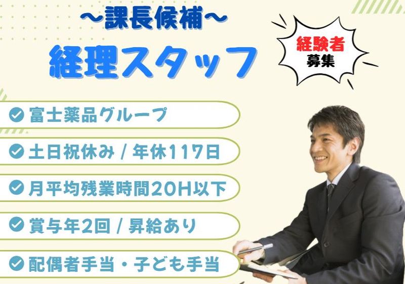 仕事内容 ドラッグストアなどで見かける ”あの製品”も 実は当社で製造しています! 当社は、グループ会社で販売する医薬品 に加え、多くの製薬メーカー様から信頼 をいただき、医薬品、健康食品、清涼飲 料水の受託製造を行っています。 ー・ー・⭐ここがポイント⭐ー・ー・ ✅業界最大手の富士薬品グループ ✅課長候補として会社の中核を担う方の募集 ✅決算業務(月次・年次)の経験を活かせる ✅完全週休2日制×土日祝休み ✅残業月平均20H以下 ✅賞与年2回支給 ✅扶養手当など、各種手当あり ✅無料ドリンクなど、福利厚生も◎ ー・ー・ー・ー・ー・ー・ー・ー・ー・ー・ ⭐仕事内容⭐  ̄ ̄ ̄ ̄ ̄ ̄ ̄ ̄ ̄ ̄ ̄ ̄ ̄ ̄ ̄ ̄ ̄ ̄ これまでのご経験やスキルに応じて、 下記の経理業務全般をお任せいたします。 ⏩月次・中間・年次決算業務 月次、中間、年次の会計期間における 財務諸表の作成、分析を行います。 ⏩原価計算・管理会計 製品の原価計算、予算管理、経営分析 など、経営判断に資する情報を 提供します。 ⏩税務業務 法人税、消費税、法人地方税などの 申告業務、税効果会計、国税局対応を 行います。 ⏩決算関連業務 監査法人対応など、決算手続き全般を 担当します。 ⏩公租公課 上記税務業務に加え、その他の公租公課に 関する業務を行います。 ⏩メンバーの取りまとめ 課長候補として、将来的には チームメンバーの指導・育成、 業務管理をお任せします。 ⭐入社後のステップ⭐  ̄ ̄ ̄ ̄ ̄ ̄ ̄ ̄ ̄ ̄ ̄ ̄ ̄ ̄ ̄ ̄ ̄ ̄ 入社後は、先輩社員による丁寧な OJTを通じて、当社の業務の流れや 進め方を段階的に習得していただきます。 あなたの経験やスキルに合わせて 業務をお任せしていきますので、 ご安心ください。 課長候補として、徐々に業務の幅を広げ、 将来的には経理部門全体を牽引して いただくことを期待しています。 ⭐この仕事のやりがい⭐  ̄ ̄ ̄ ̄ ̄ ̄ ̄ ̄ ̄ ̄ ̄ ̄ ̄ ̄ ̄ ̄ ̄ ̄ ◆ 安定した医薬品業界で、 中核メンバーとして活躍できる ◆ 人々の健康に不可欠な医薬品を製造する 当社で、経理部門のリーダー候補として、 経営に深く関わることができます。 ◆幅広い経理業務に携わることができる◆ 決算業務から税務、管理会計まで、 多岐にわたる経理業務を経験することで、 専門性を高めることができます。 ◆将来のキャリアアップを目指せる◆ 課長候補としての採用であり、ご自身の 成長とキャリアアップを支援する環境です。 ⭐当社について⭐  ̄ ̄ ̄ ̄ ̄ ̄ ̄ ̄ ̄ ̄ ̄ ̄ ̄ ̄ ̄ ̄ ̄ ̄ ̄ ✅社会貢献性バツグンのパナケイア製薬 製薬業界大手の富士薬品グループである パナケイア製薬。 社名の「パナケイア」とは古代ギリシャ語で 「すべてを癒やす」という意味です。 当社製品を選んでいただいた方の健康のため に日々業務に向き合っています! 日本でも当社でしか製造していない製品も あり、日本の医療、人々の健康を守る 誇りあるお仕事です。 ◆◇ 待遇面も充実! ◇◆ 「完全週休2日制」 「月平均残業20時間以内」など、 プライベートをしっかり確保できる 働き方が可能です!